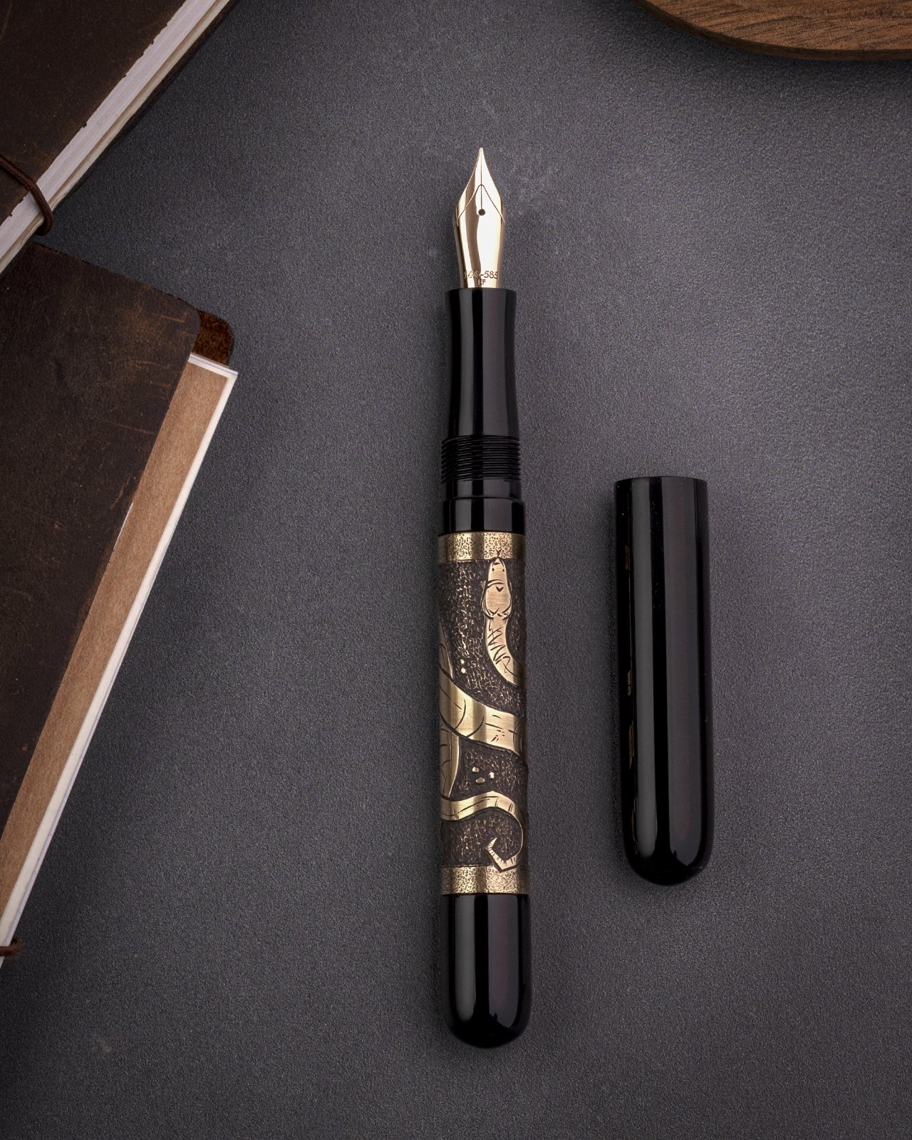 I come up with something every now and then. I'm happy with this pen. Brass and ebonite. Gold JOWO nib. The snake design is cool because it winds around the wrapping.