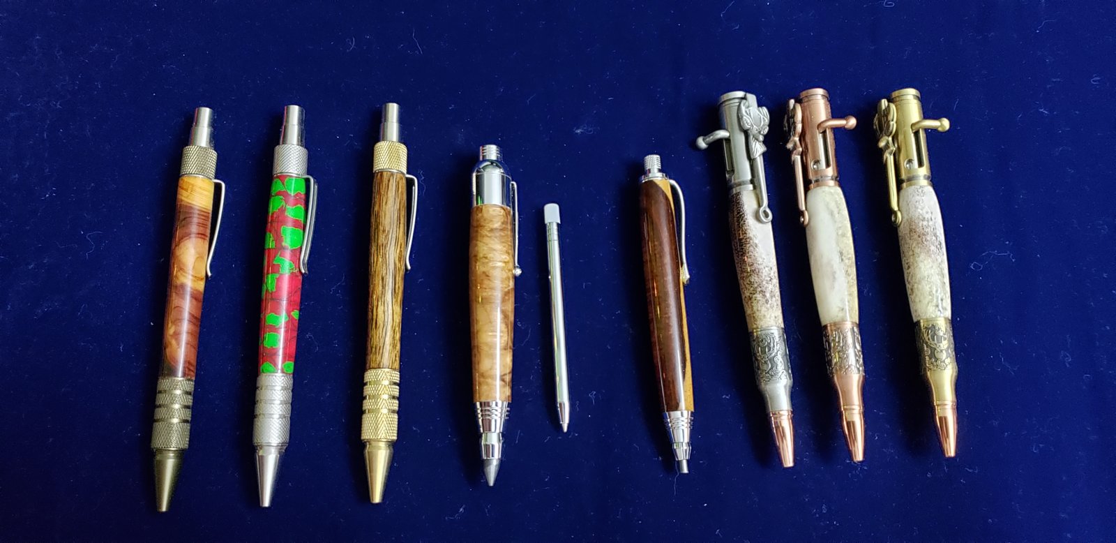 I finished these on this last weekend. Except for the two bolt actions on the far right, those are from before. The EDC on the left is my new favorite that I use at work. The materials (from left to right) are Juniper, Wild Watermelon, Shedua, Maple Burl, Cocobolo, and Antler.