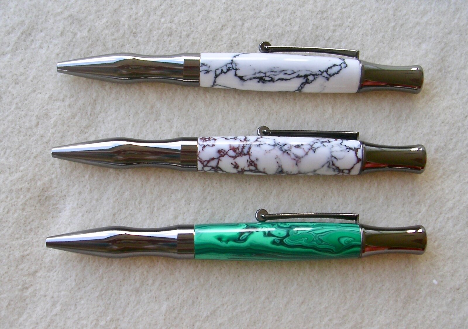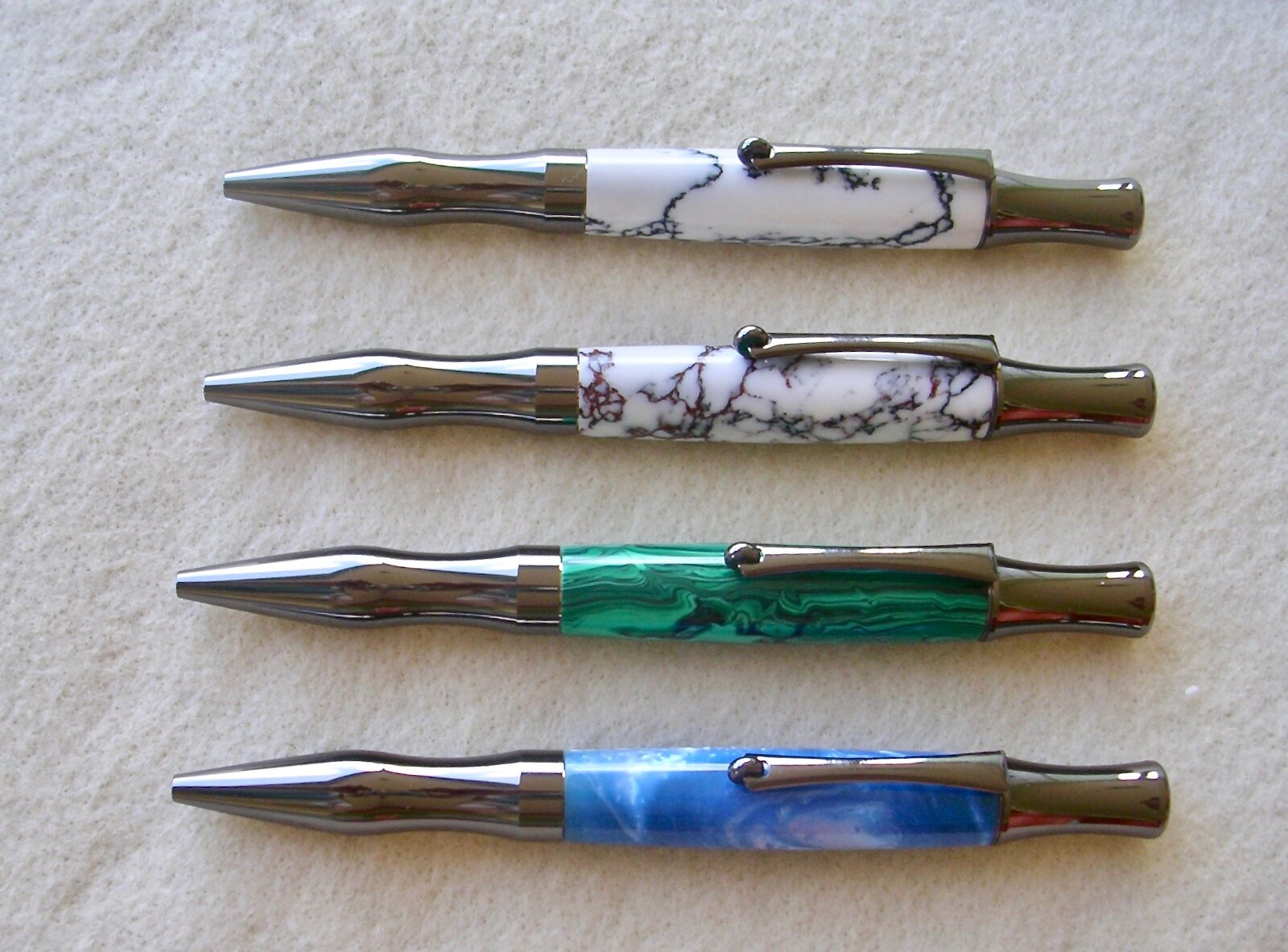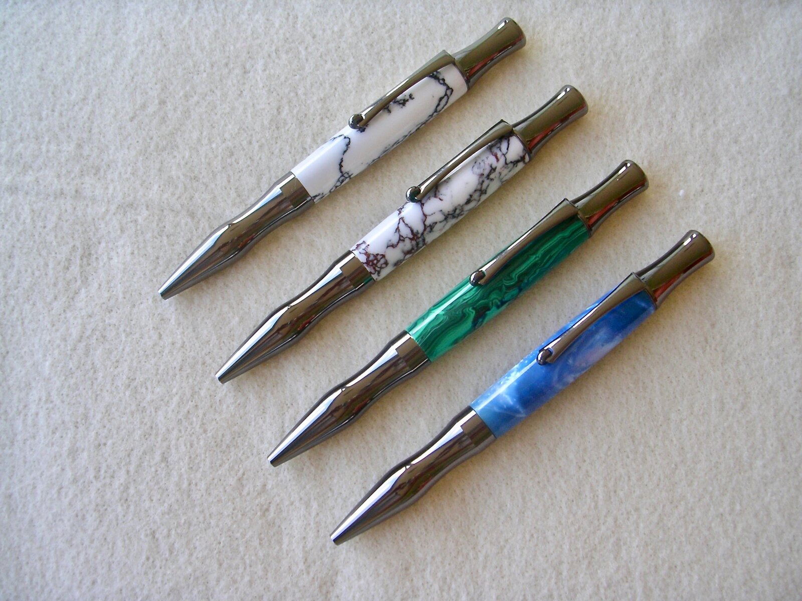My wife likes the Virage Ballpoint pens so I picked up four that were on sale at BearToothWoods and used some TruStone blanks on three of them and an InvisibleBlank I bought years ago. The TruStone blanks used are Banded Malichite, White Turquoise and Wild Horse Jasper. My wife picked out the blanks.