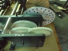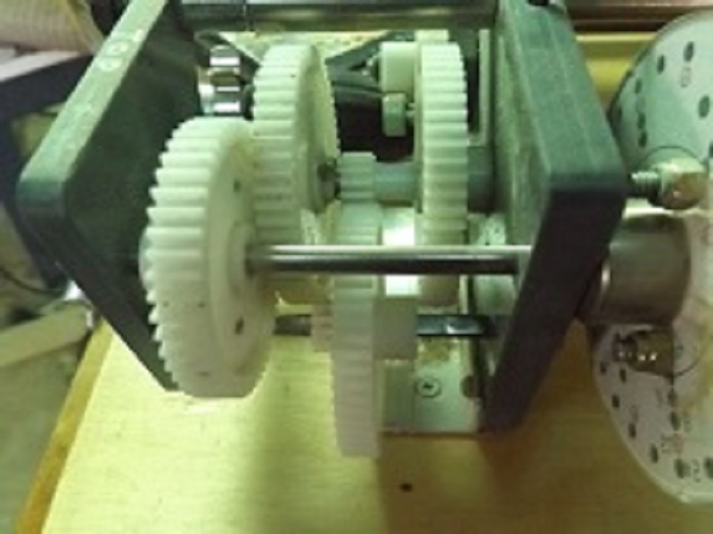 The gear arrangement on the top left side are 12 and 60 teeth gear joined together, drilled, fitted with a slimline tube to act as a bush