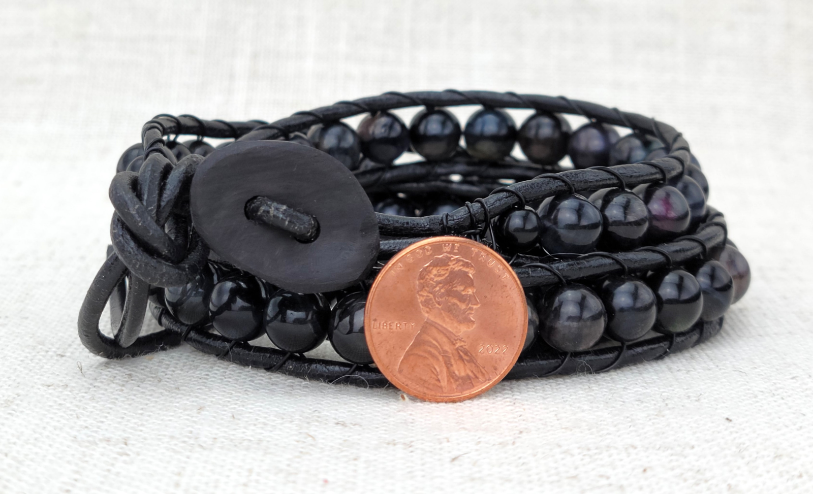 I make my own buttons for bracelets. Just a thought, if you want to include a button, you can take a scrap piece of wood and shape it so it will curve around the barrel. I purposely make mine out of round and in odd shapes. Walnut shells work fantastic for this, too.