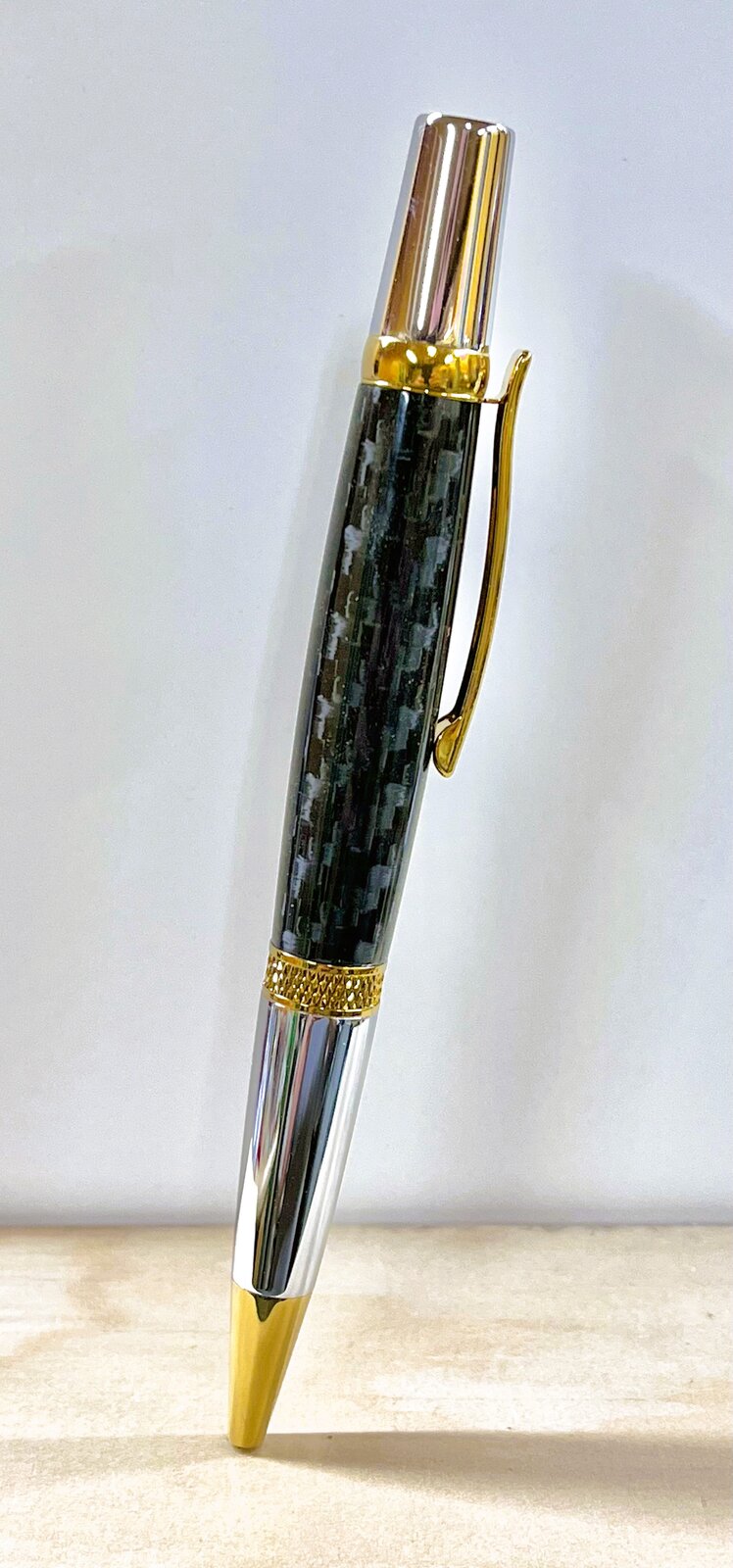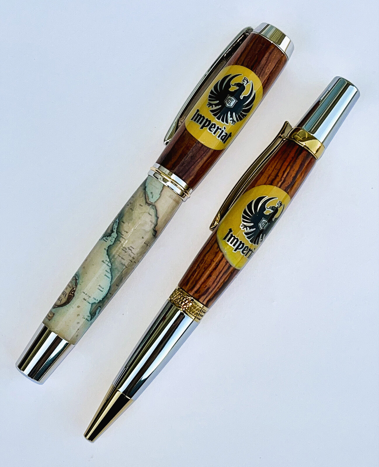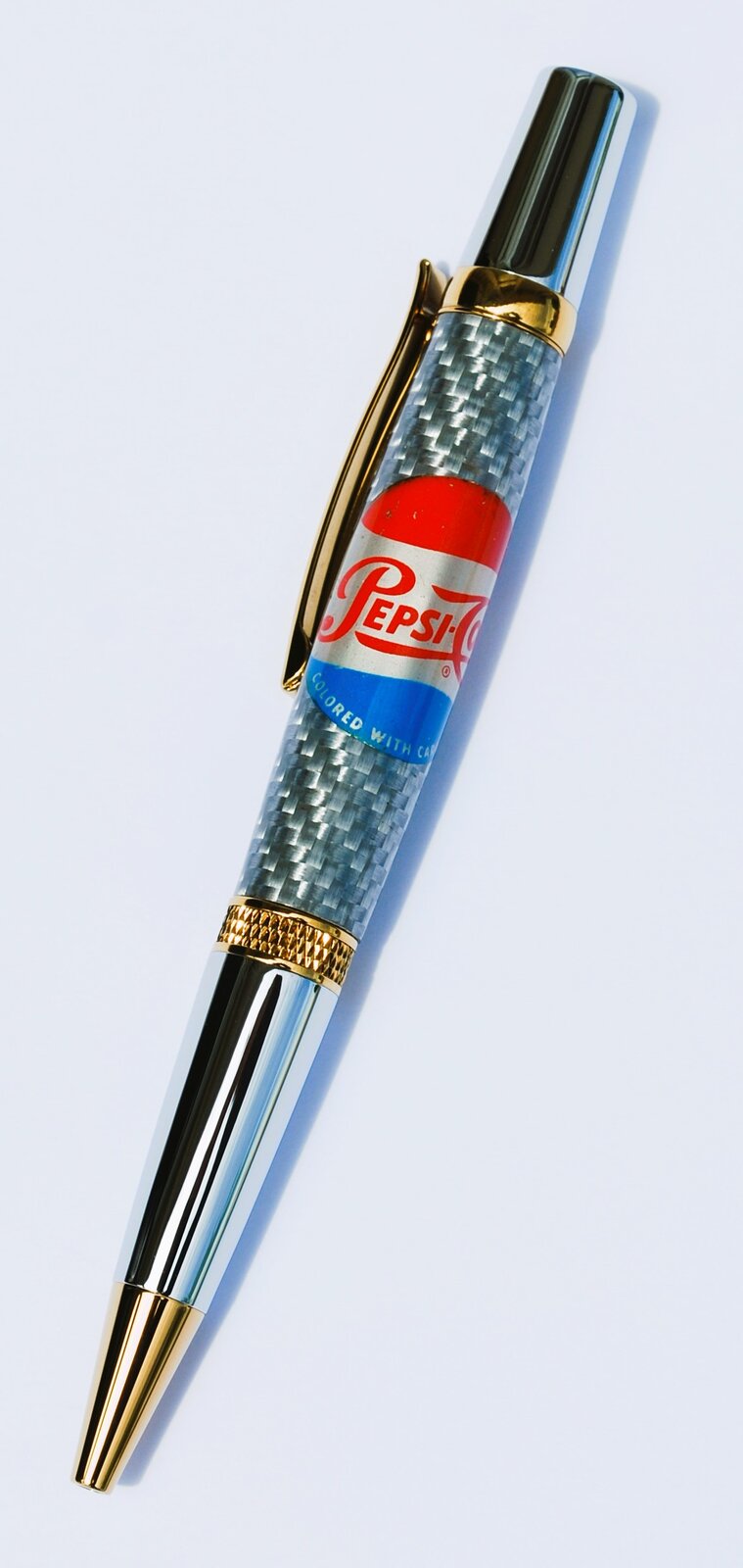 The first is a vintage soda cap over silver carbon fiber on a gold and chrome diamond knurl Sierra.