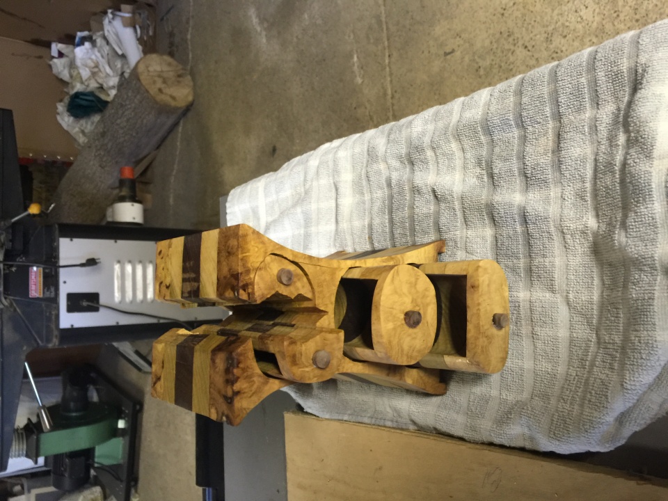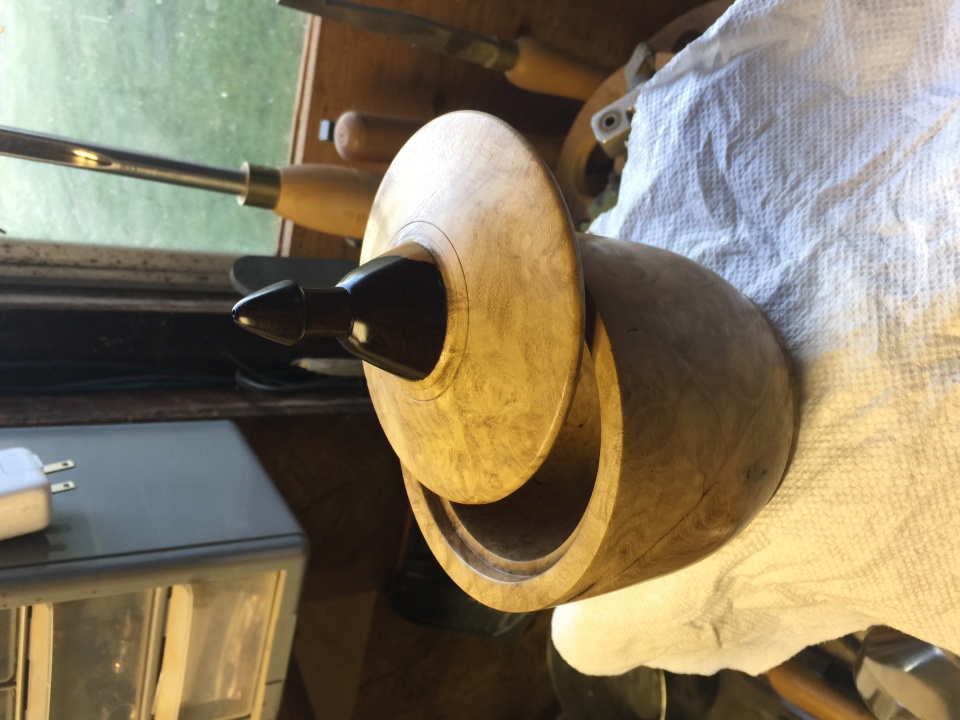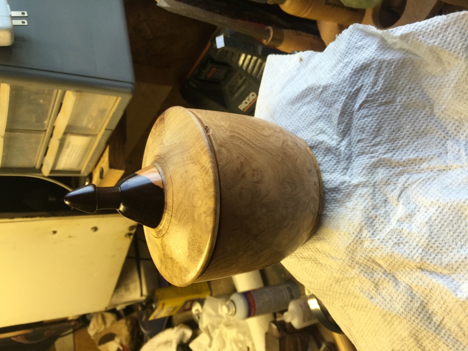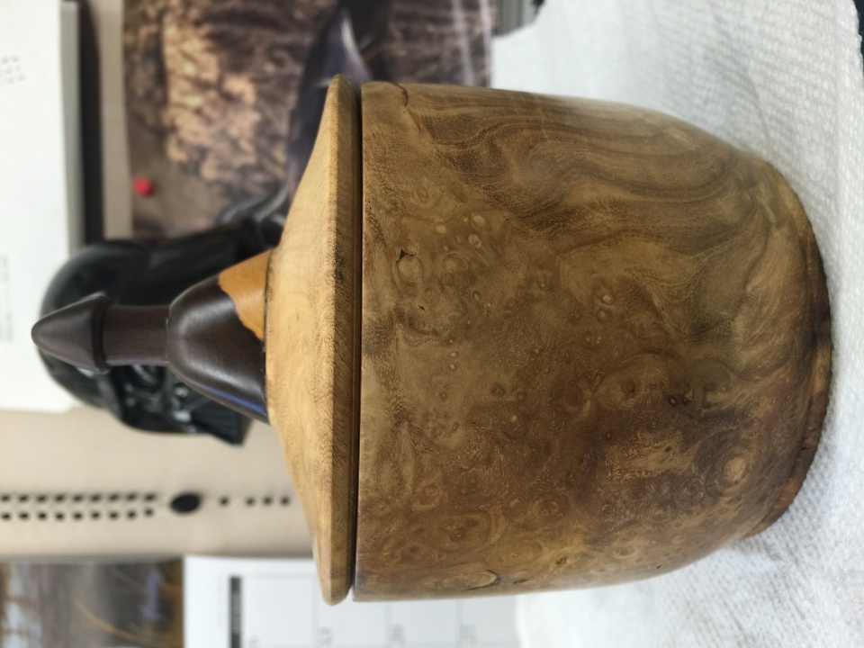 The lidded pot was practice for an urn for my dog that passed away, it's made from black locust burl and unsure of the wood for the spire. The other is a cracked bandsaw box made from black locust burl and black walnut