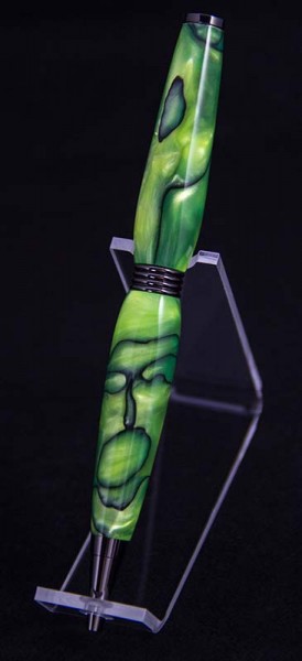 The two executives are Amethyst silk blank on Rhodium and BOW on Black Titanium. The Slimlines are Osage Orange Wood on Gold components and Maple on Chrome with some grip grooves. The last one I call the Monster Inside, made form a Green and Black Acrylic from Pen State on Gun Metal components. I found it kind of scary that a face showed up in the turning. Didn't see it until we were taking pictures!