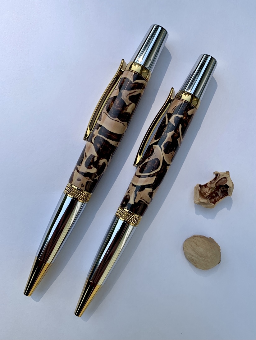 I had the honor of making a few items lately for gifts. The first is a set of Sierra knurl ti gold and chrome pens. These were made for my neighbors who just celebrated their 60th wedding anniversary. The pens were made from hickory nuts I gathered from their family tree in their front yard, cast in bronze resin. It's a tree her parents planted when they lived there.