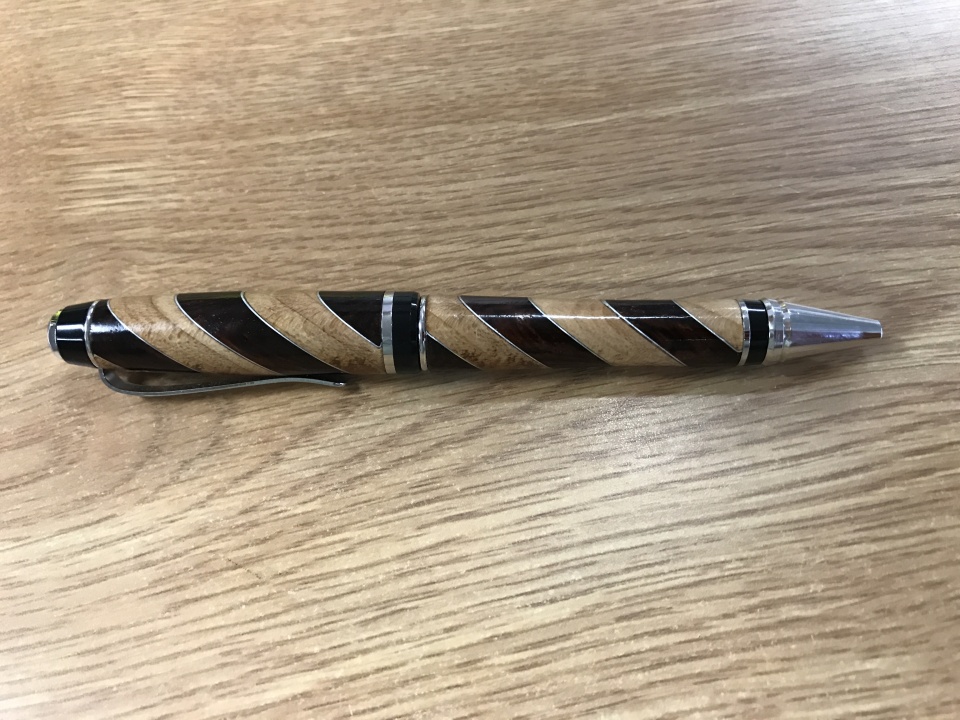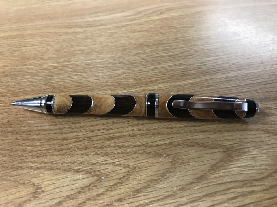 This pen is a Big Ben kit from PSI. The blank was made from 1/4" strips of cocobolo and hard maple with aluminum flashing between each piece of wood. Afterwards the whole thing was cut at an angle. I like how the parts align differently when the tip is exposed or retracted.