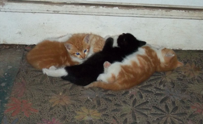 They belong to a stray calico that showed up very pregnant at the end of June. I believe she had these on the 4th of July because I saw hwe on the 3rd and she was still preggo and on the 4th she was in the bushes all covered in afterbirth. I thought that she may have abandoned them because I didn't see them but she is apparently a better momma than I thought.