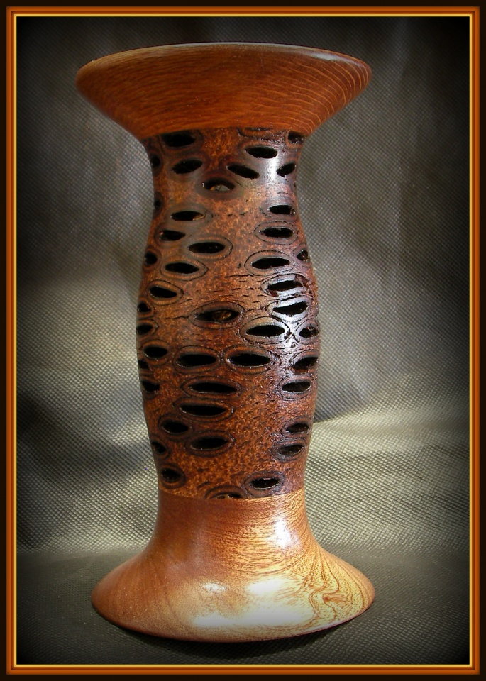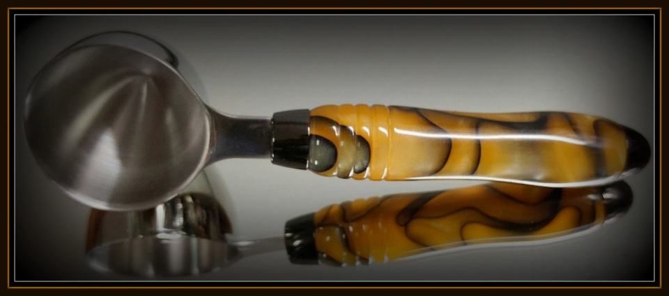 I decided to try my hand at something other than pens and finished a few diverse pieces. The first is a small vase made from a banksia seed pod with Sepele base and Lacewood top. The second is my first bowl made from Chinese Tallow. The third is a coffee scoop from an Exotic Blanks acrylic blank called Honey Trails.
