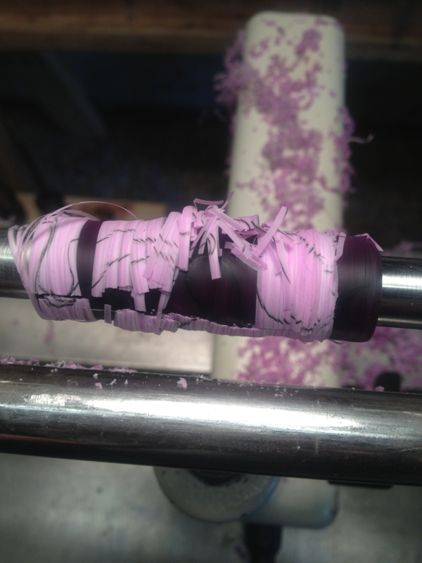 Anyway, I made a pass from right to left and ended up with this. As the shavings came off, they immediately wound around the blank you can actually see the black line in the blank in the wound shavings! The color if the blank you can see in the finished picture.