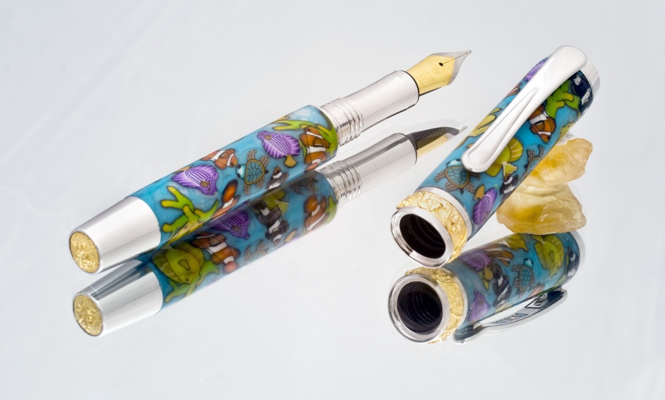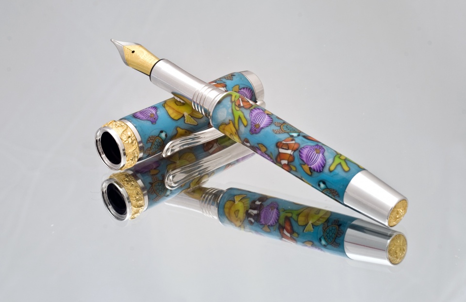 Had to do some last minute changes and it went into a hybrid configuration. Here we have a non-postable Aaron in RHODIUM and 22KT GOLD from Jon David Jones of Signature Pen Supply, the polymer clay was done by our very own Toni Ransfield. The setup is hybrid, that is rollerball AND fountain pen.