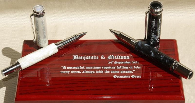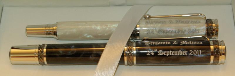 My Son was married Saturday the 24th. Since I had made a set of pens for my Daughter for her wedding last year I just had to make some for my Son. The blanks came fron Brooks803 (Opal and what I call Black Pearl) thanks Jonathon. Constant at Lazer Linez did the engraving. My Son and Daughter-in-Law seemed to like them so that is all that matters. Enjoy, comments welcome.