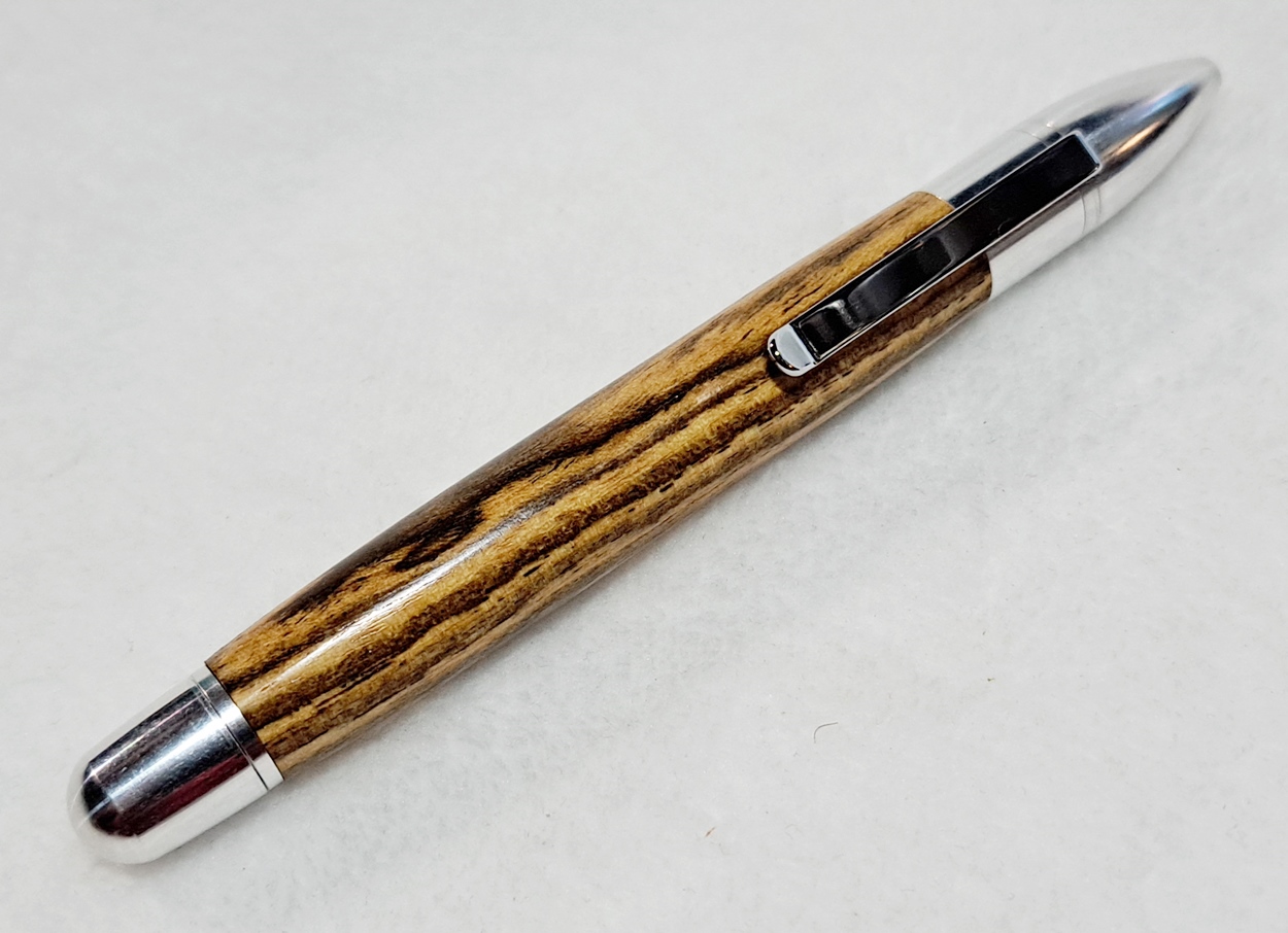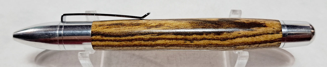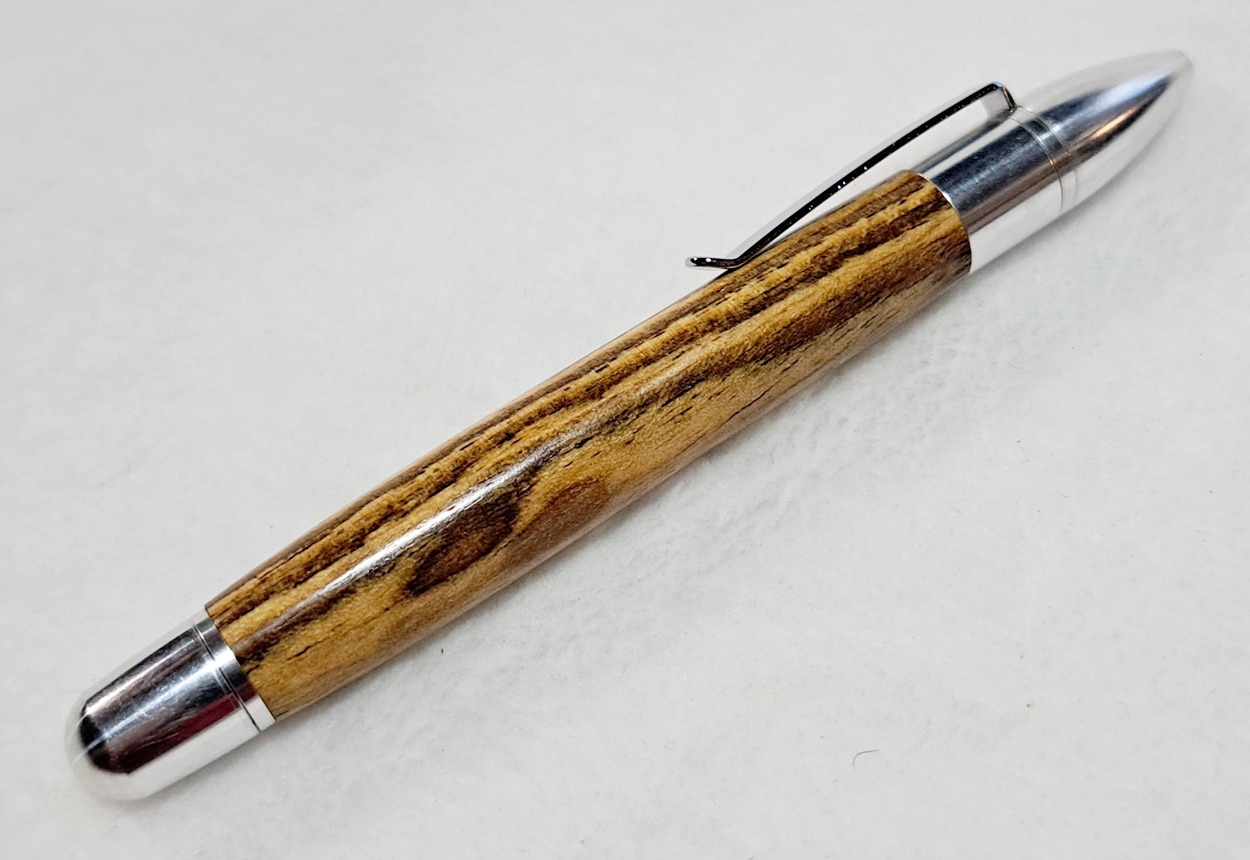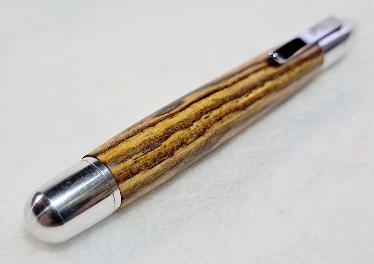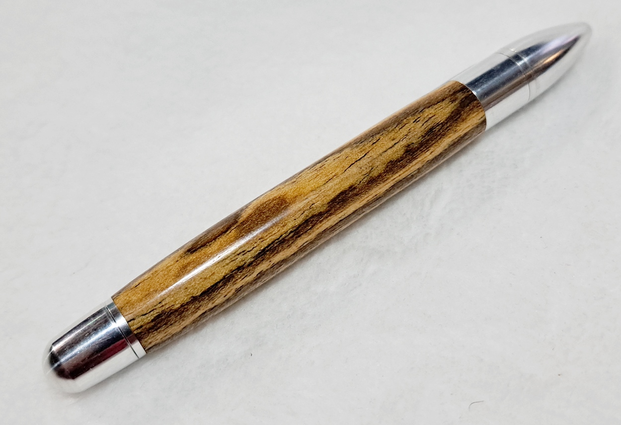 This is a PSI Sophro Capless twist rollerball pen in aluminum. AKA the "Upside Down Pen". Unique design. The wood is Zebrawood (Thanks Dave!). The finish is Mylands.