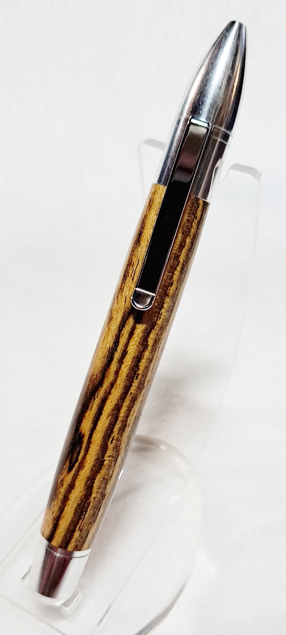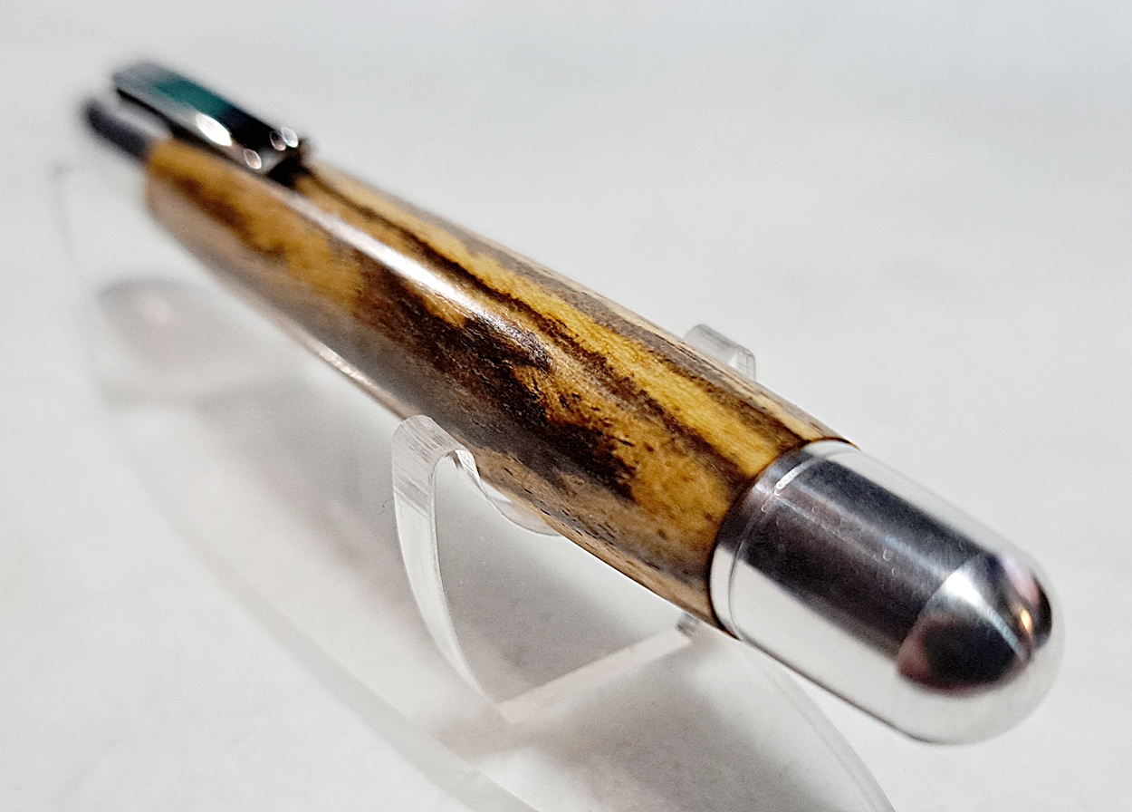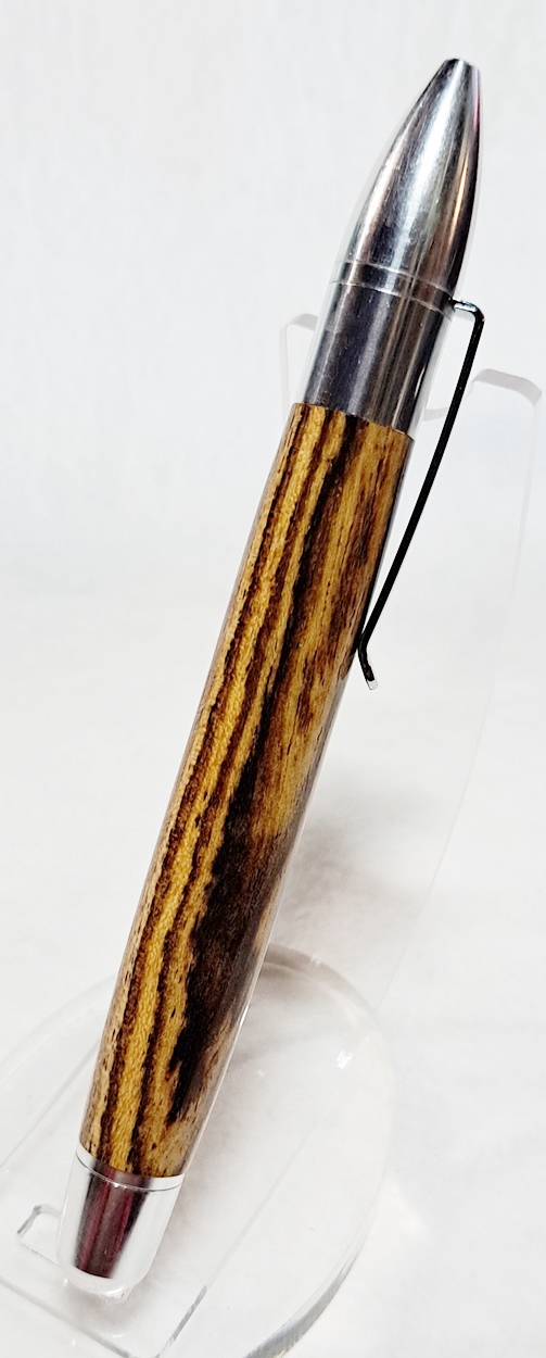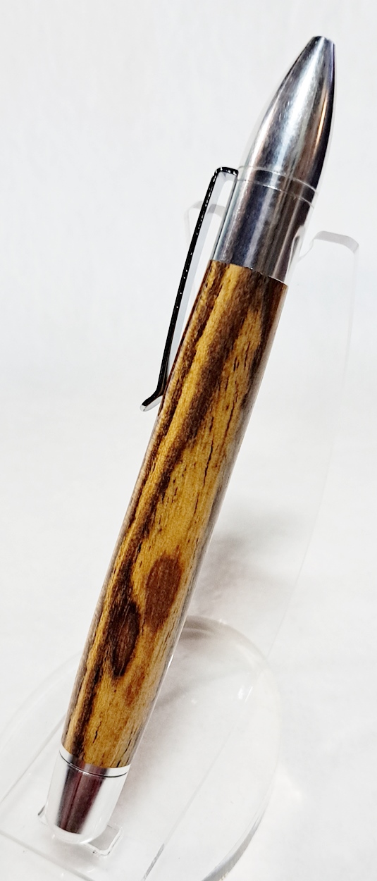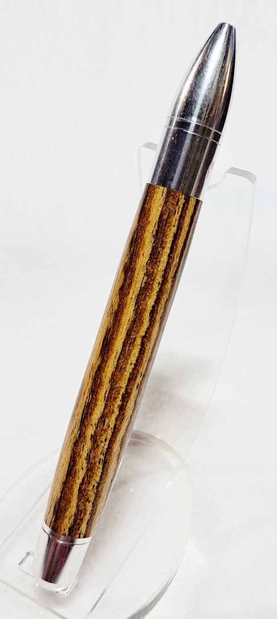 This is a PSI Sophro Capless twist rollerball pen in aluminum. AKA the "Upside Down Pen". Unique design. The wood is Zebrawood (Thanks Dave!). The finish is Mylands.