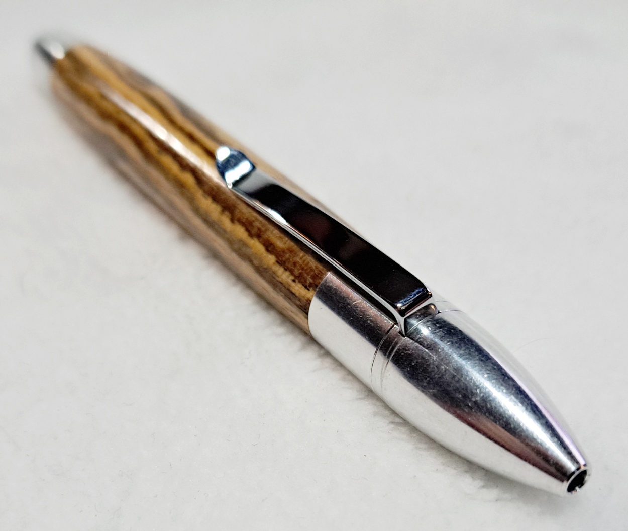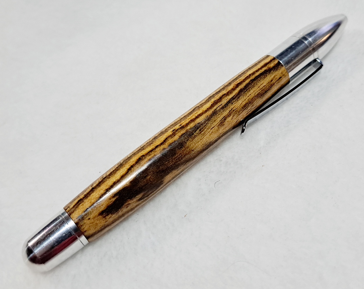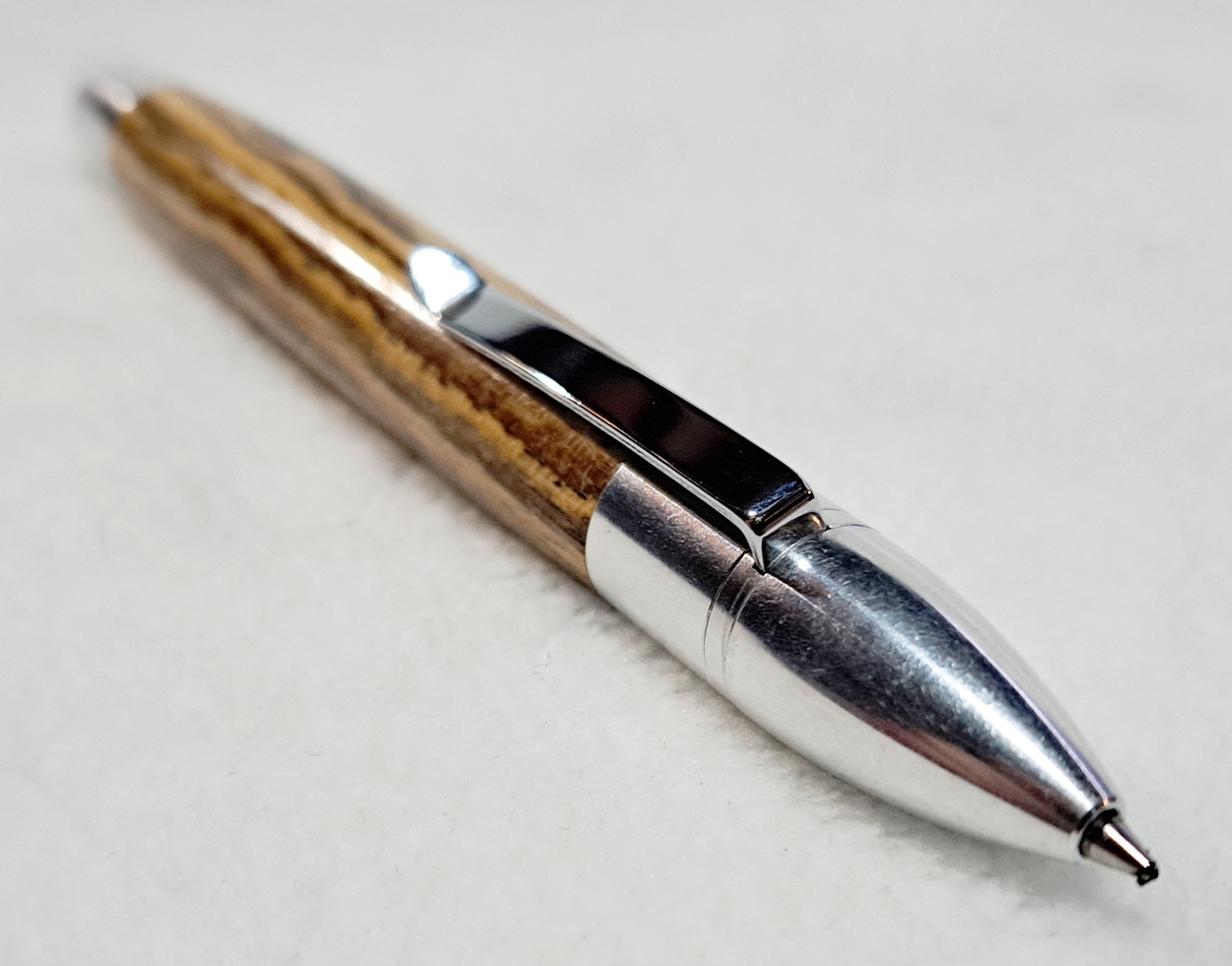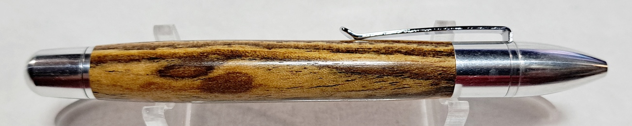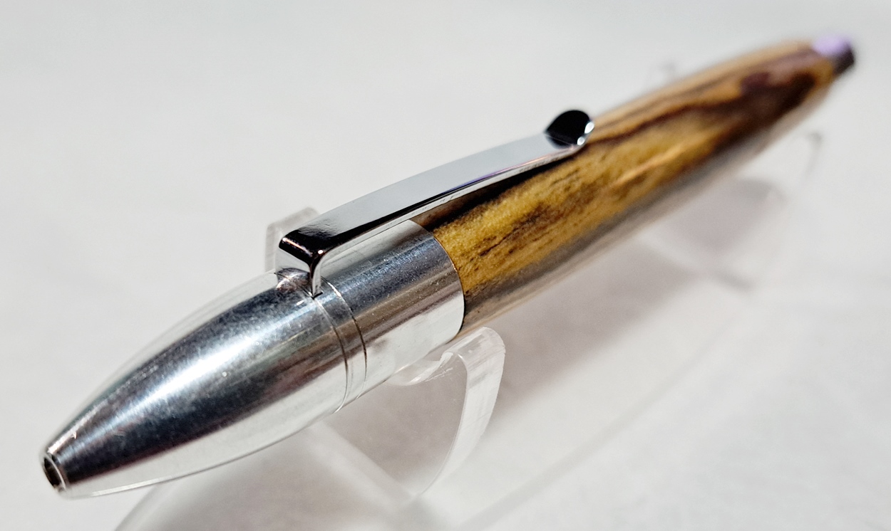 This is a PSI Sophro Capless twist rollerball pen in aluminum. AKA the "Upside Down Pen". Unique design. The wood is Zebrawood (Thanks Dave!). The finish is Mylands.