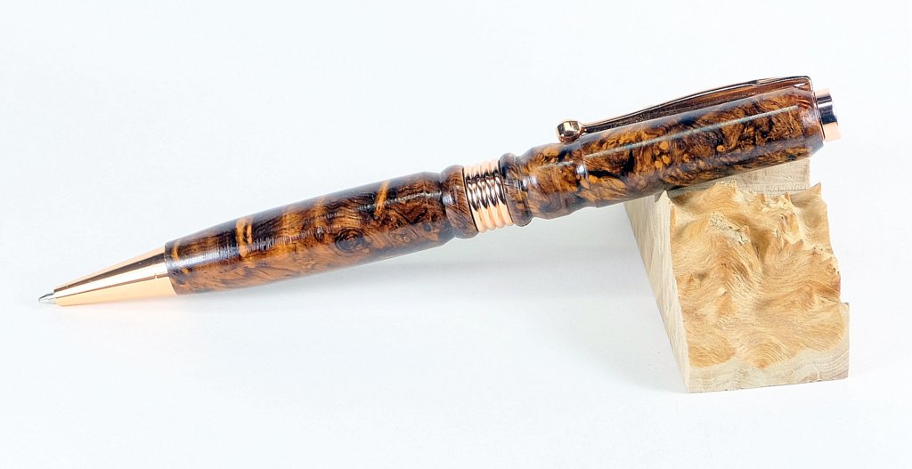 i prepared about 50 Slims with the larger centre band,a dull brown one marked SAM Burl. Well I searched my memory bank (had the blank forever). Then Revelation number 44 this ugly duckling turned before my very eyes just now into this georgeous pen,Striking patterns all over.