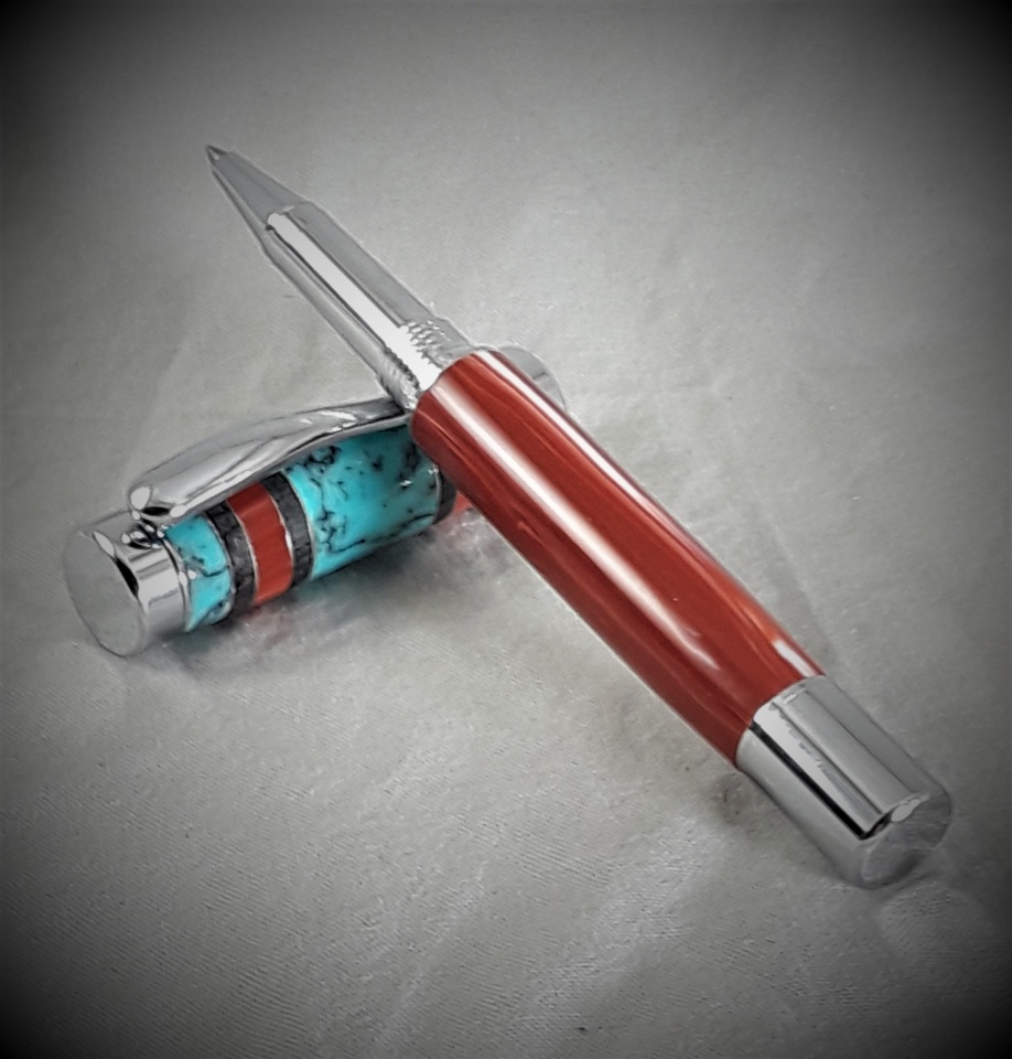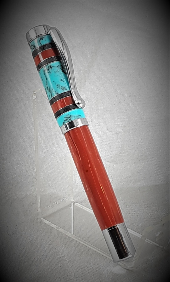 This was a nightmare. Pen barrel is alt. coral. Cap was going to be the same until it blew up on me. Had a piece of TruStone turquoise and some blackwood,so decided to go for the southwest look. Laid out the materials, came up with a design and cut and glued everything up using CA. Drilled on lathe and it came apart. Re-glued on the tube and turned. Bushings stuck and it broke apart once again. Re-glued, again. Sanded, again. Polished, again. Victory! And here is the result. Please enjoy. As always C & C's welcome.