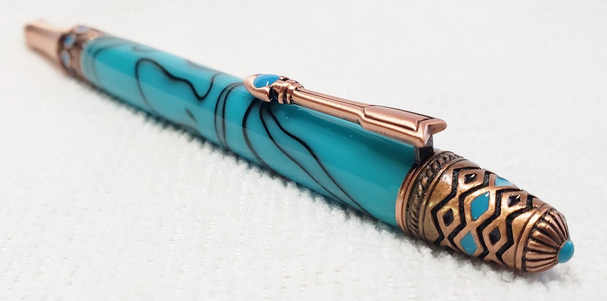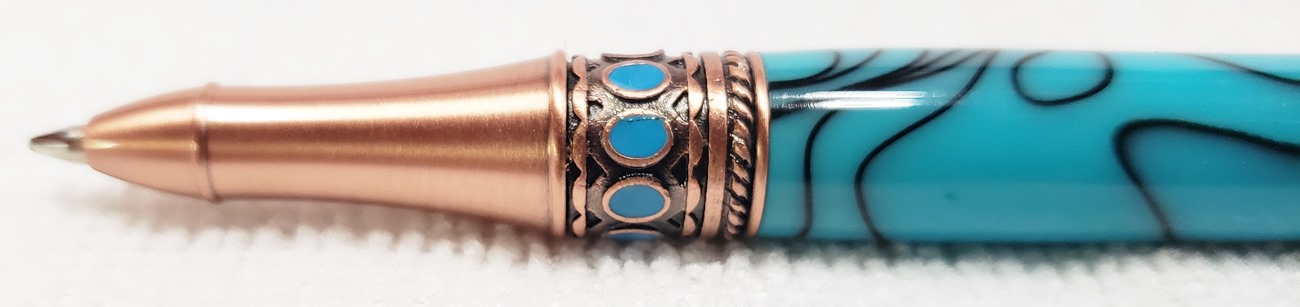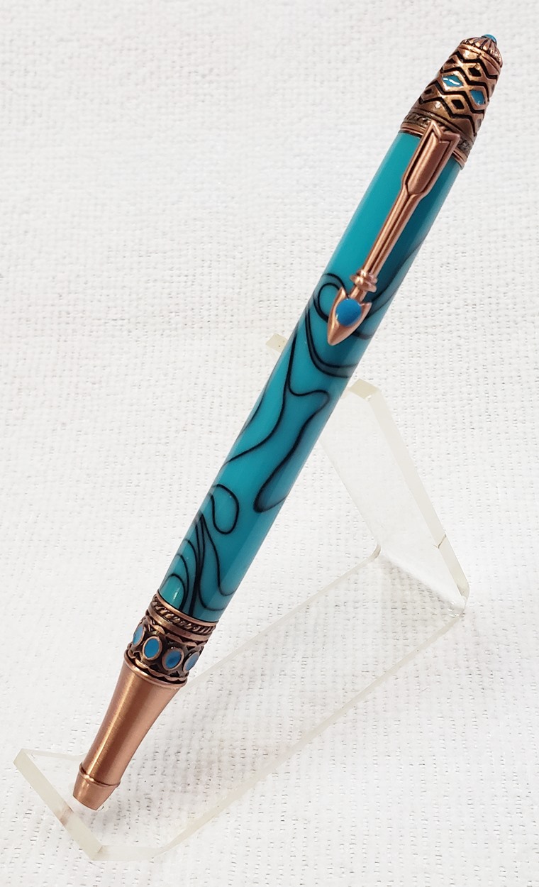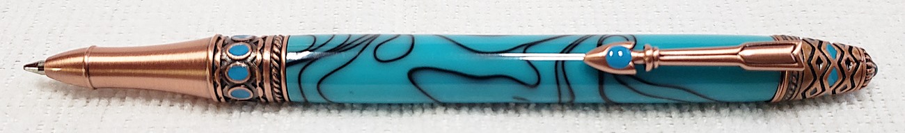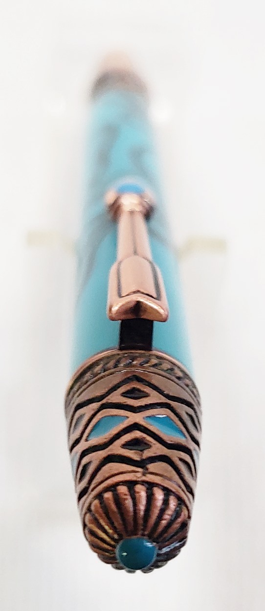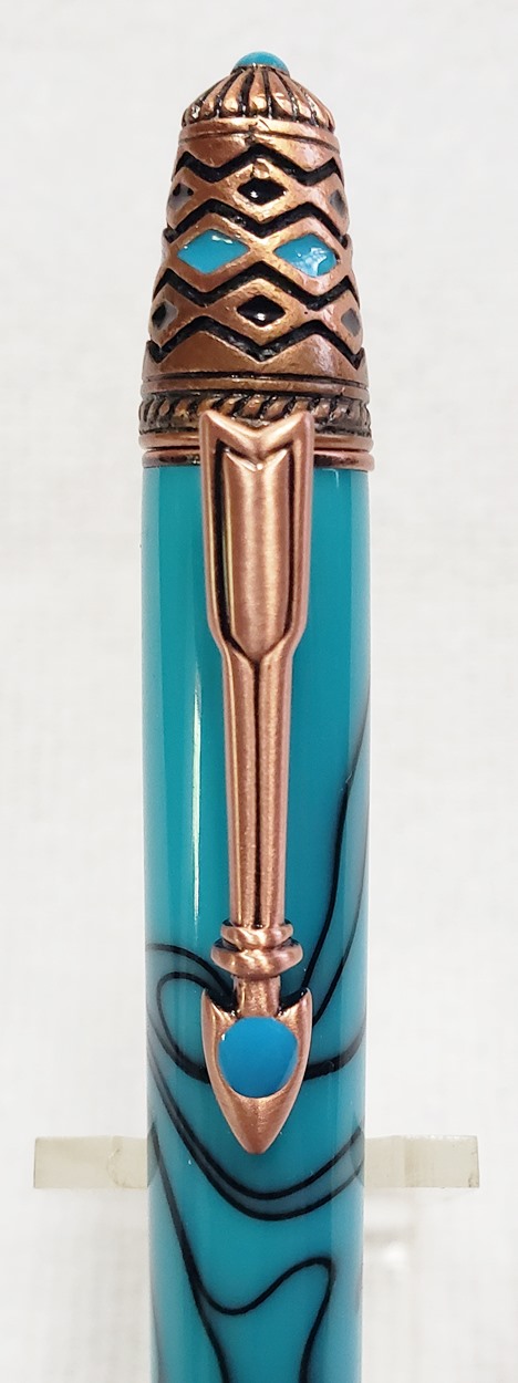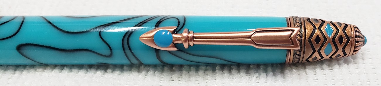 This is a PSI Southwest Mesa pen in antique copper. The blank is a Lava Bright called "Deep Aqua with Black Thread". Pretty grandiose name for a blank. I didn't know if I'd like the aqua blank with the antique copper finish, but I do. I also like all the "southwest" details, especially the arrow clip.