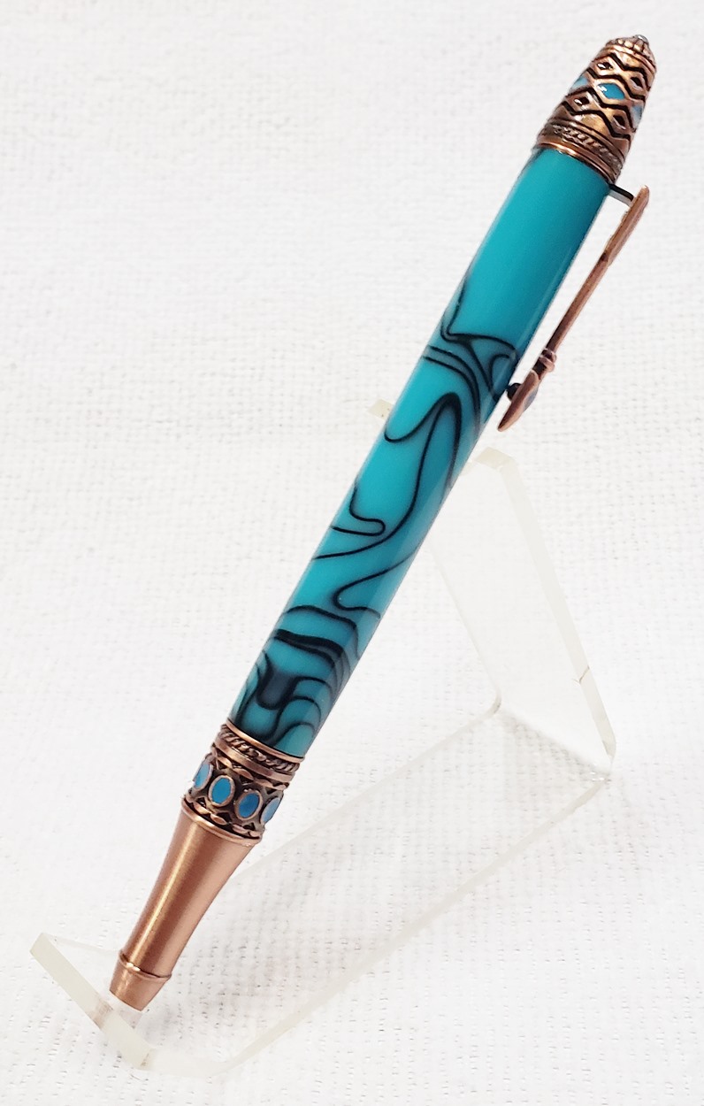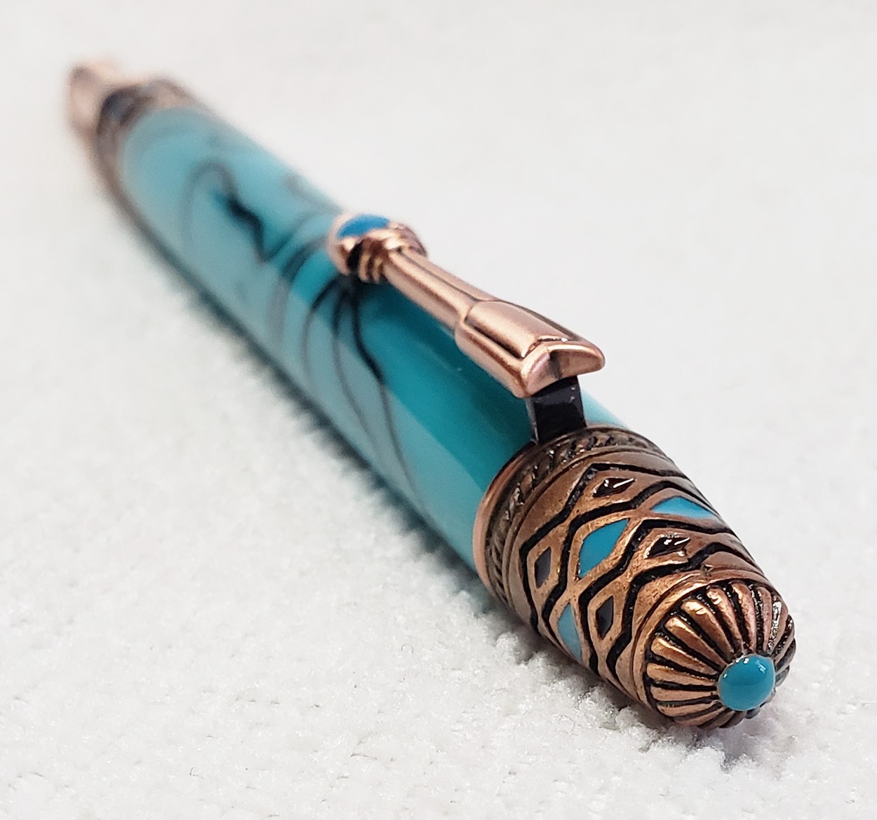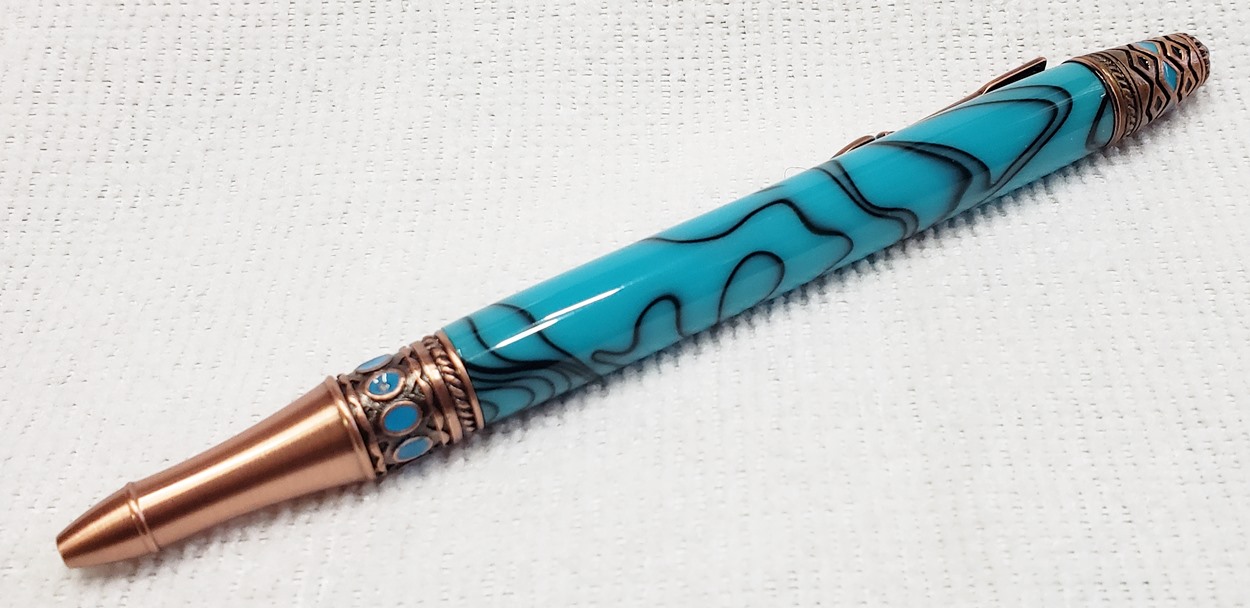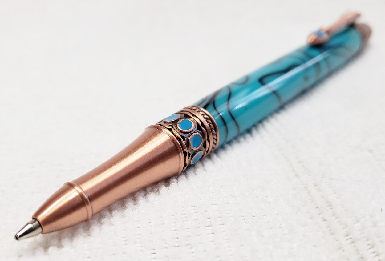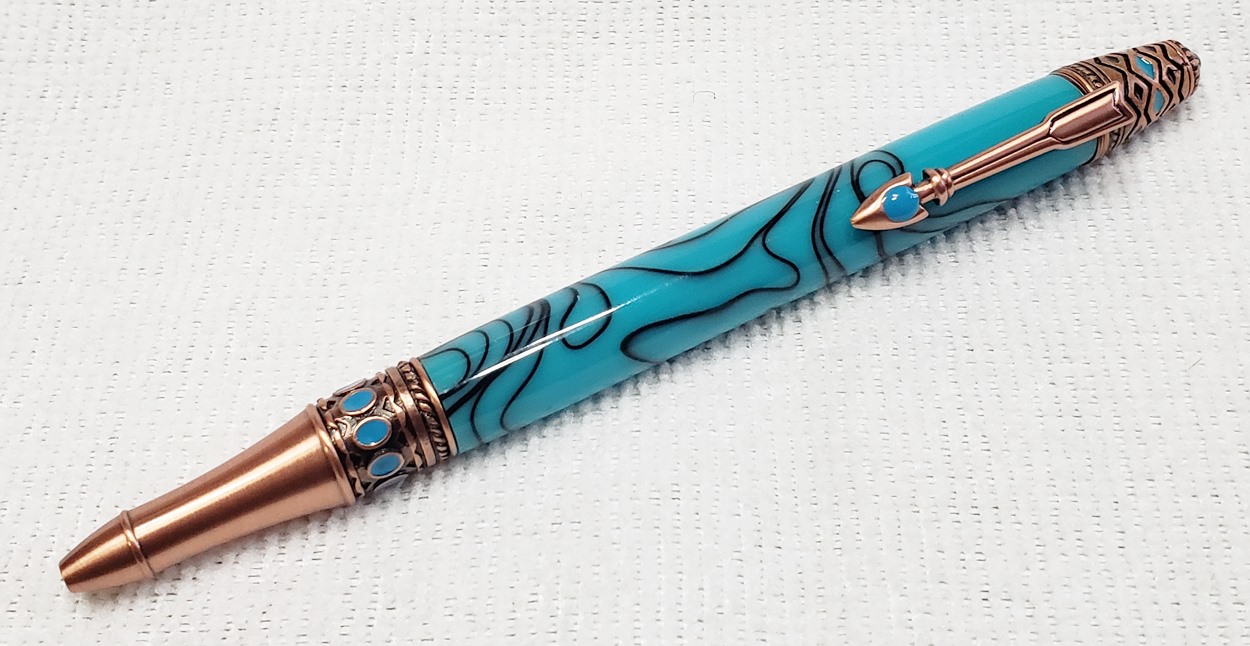 This is a PSI Southwest Mesa pen in antique copper. The blank is a Lava Bright called "Deep Aqua with Black Thread". Pretty grandiose name for a blank. I didn't know if I'd like the aqua blank with the antique copper finish, but I do. I also like all the "southwest" details, especially the arrow clip.