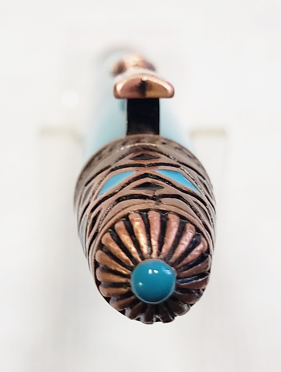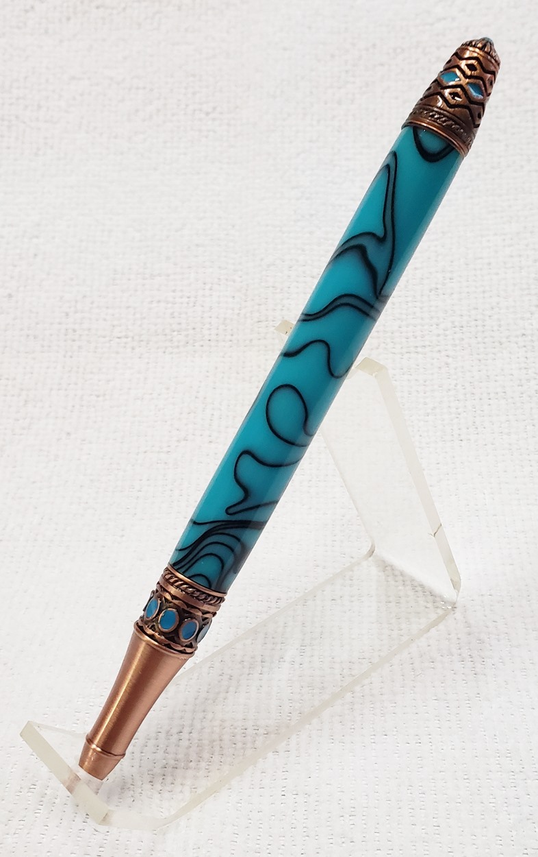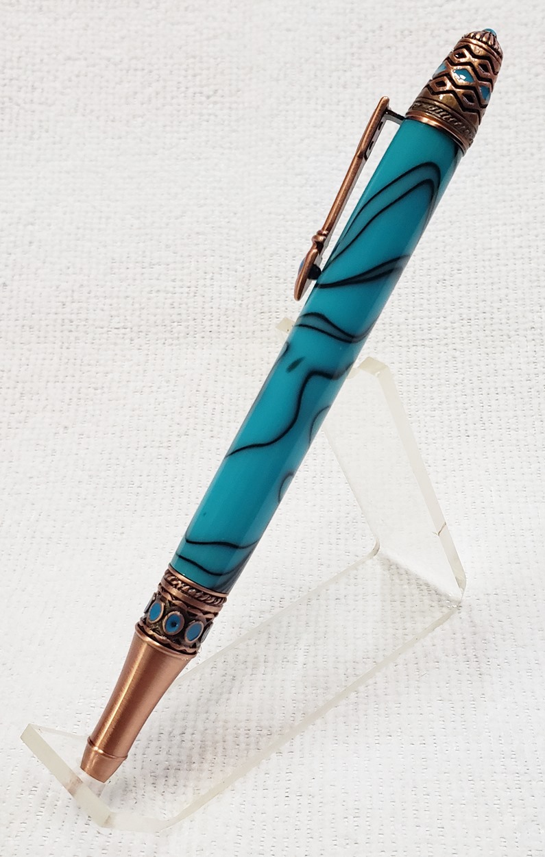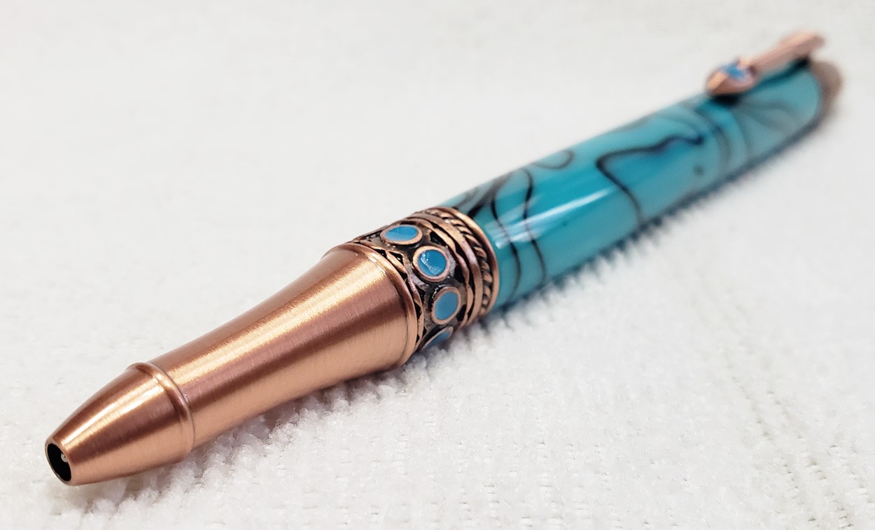 This is a PSI Southwest Mesa pen in antique copper. The blank is a Lava Bright called "Deep Aqua with Black Thread". Pretty grandiose name for a blank. I didn't know if I'd like the aqua blank with the antique copper finish, but I do. I also like all the "southwest" details, especially the arrow clip.