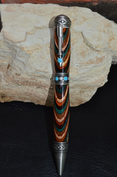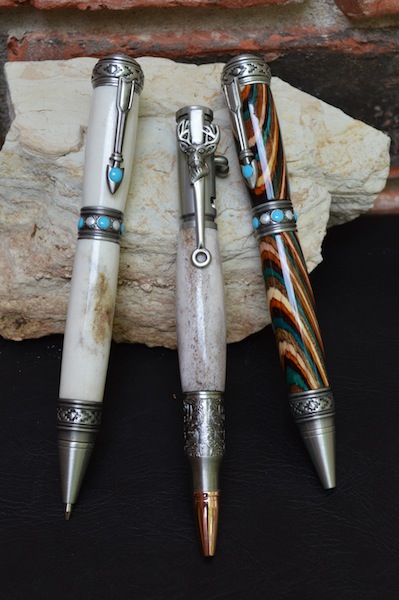 The 2 on the ends are the same Southwestern pen - Pewter with Turquoise accents. The left is made with Deer Antler and the right is made from a multi-colored segmented blank.
