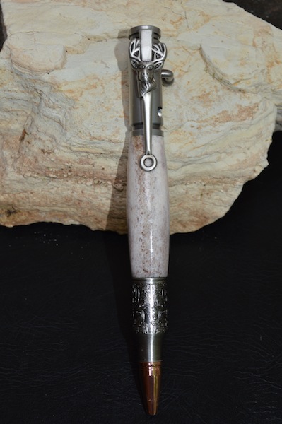 The middle is the newer 30 Caliber Bolt Action pen with detailed engraving by the nib and a Deer Head clip. It too is made from Deer Antler.