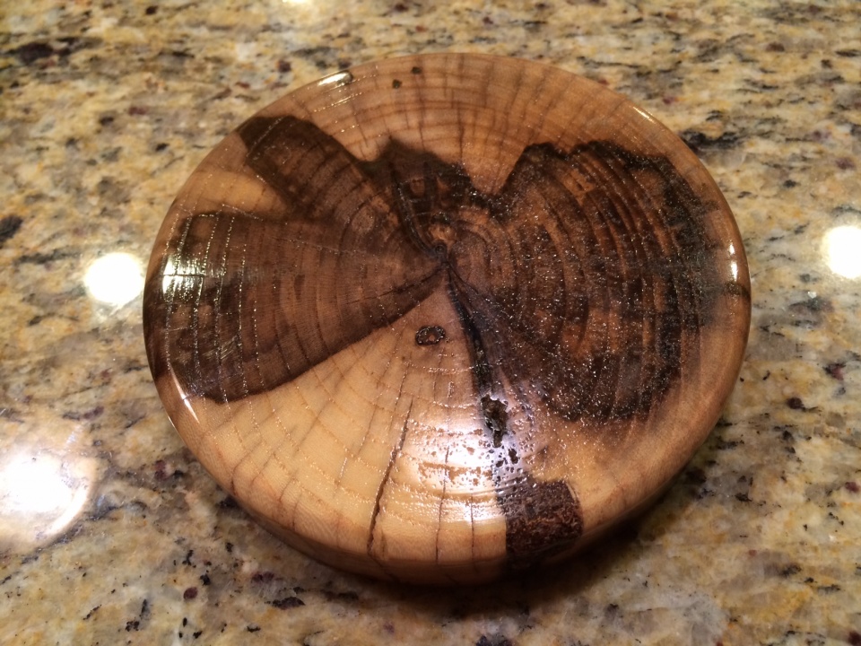 A friend gave me a bad pice of wood but it had this interesting spalted "butterfly" design so I decide to try and save it. The trivet is about 1" thick and 6" in diameter. Rather unique. RossVH