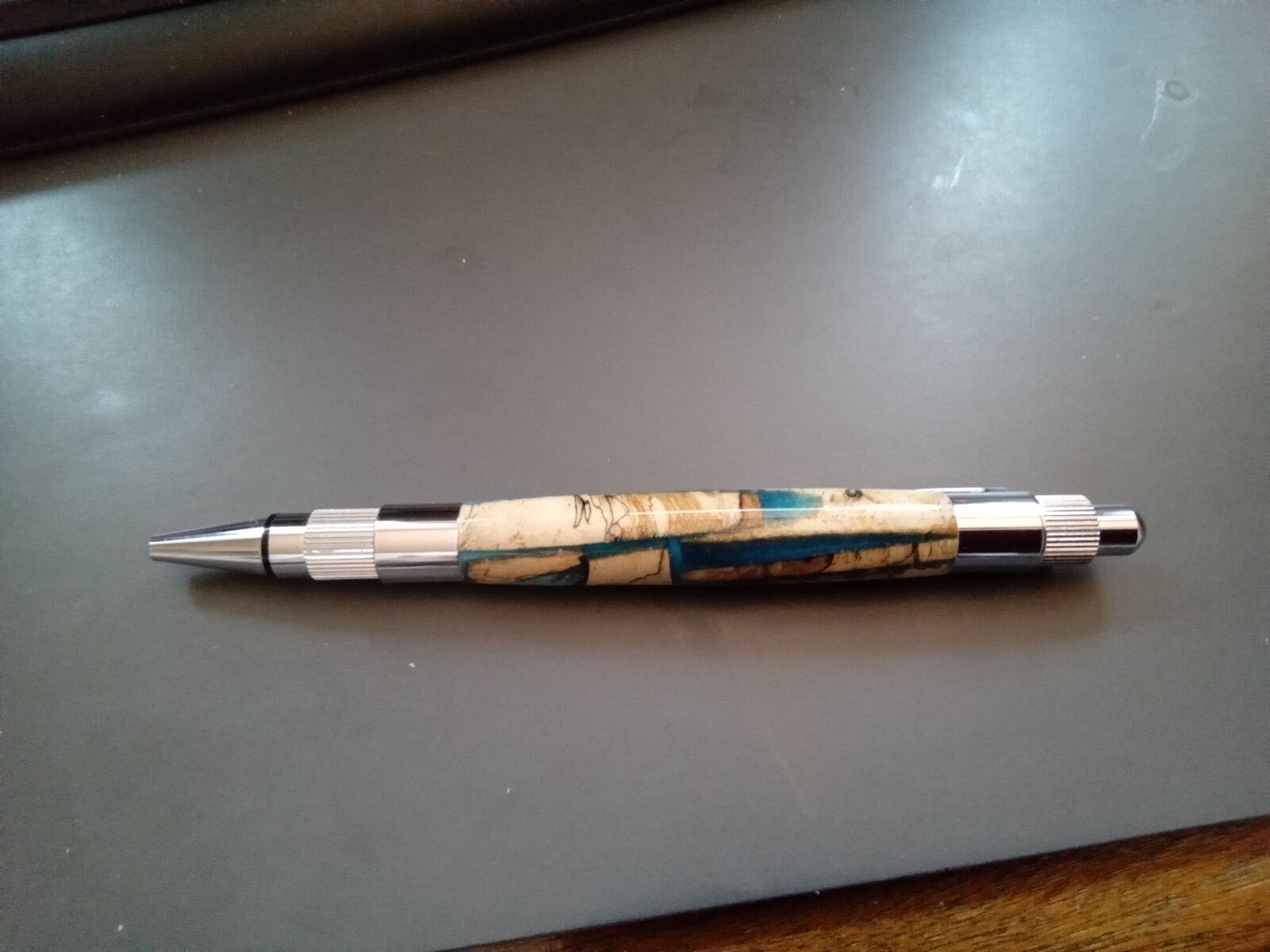 Been on the road for the past week but got home early enough yesterday to pop out at least one pen. Stratus of spalted tamarin chunks from a bowl set with blue epoxy.