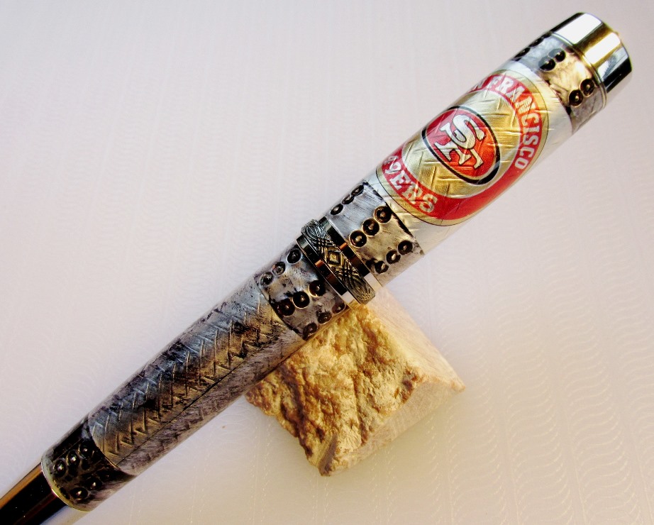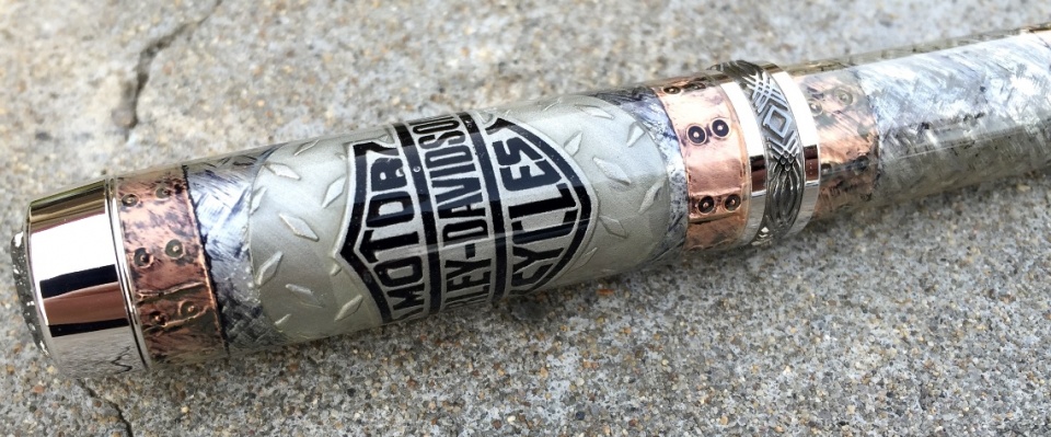 One of the folks I turn to for some custom logo hammered foil cast blanks is Mark (Marko50). These two are just a few of the ones he's done for me that I wanted to show. The Harley mounted on a Emperor Black Ti kit is for me. The SF 49'ers mounted on a Statesman is for my son who is a huge fan (I tried to raise him right, but this was one area I missed).