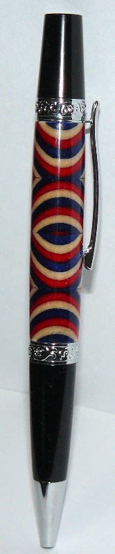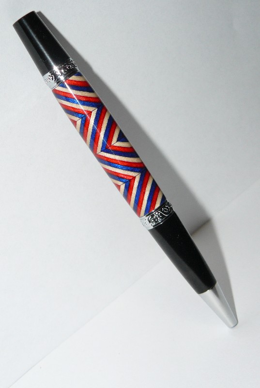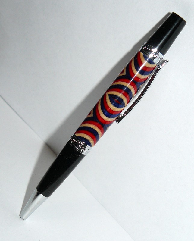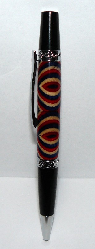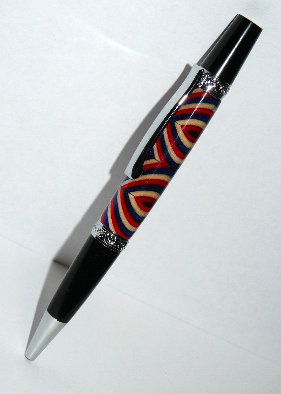 Here is the pen I made from the Spectrply sale that occurred recently. Many thanks to DavidH14 for making sure I had a straight hole drilled through this blank. Miters cut in a hand miter box and back saw. This is on a Smitty's Pen Works Leroy V2 Pen kit. Turned out better than expected for first segment to do this way. Critiques and criticisms welcome. Except for pictures. I know they stink.