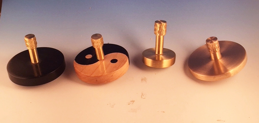 Recently our wood turning club did some demos at the State Fair and Makerfest. Many of us turn tops to give away to the kids that stop and look and its often difficult to keep up with the demand. As I started to look for some new ideas I ran across several sites where many makers are getting spins of 10 or more minutes and a few that are up to 20 minutes. So down this rabbit hole I go with a self imposed target of 5 minutes. Here are my first 4. Starting from left to right, #1 is a simple ebony cylinder about 1.8" in diameter with a 4mm ceramic ball as the point. Record with this one is 2 minutes 20 seconds (all on a concave mirror). #2 is my yin/yang again 1.8" diameter which looked nice but due to the difference in wood densities, maple and ebony, doesn't spin well at all. Very unbalanced and lucky to get 15 seconds. #3 from brass, 1.1" diameter is my best so far with a record of 4 minutes 24 seconds. #4 from bronze 1.8" diameter, was an attempt to get more mass on the bottom. Expecting to beat my goal, the longest spin I could get is 2 minutes 10 seconds. Anyone else do these?