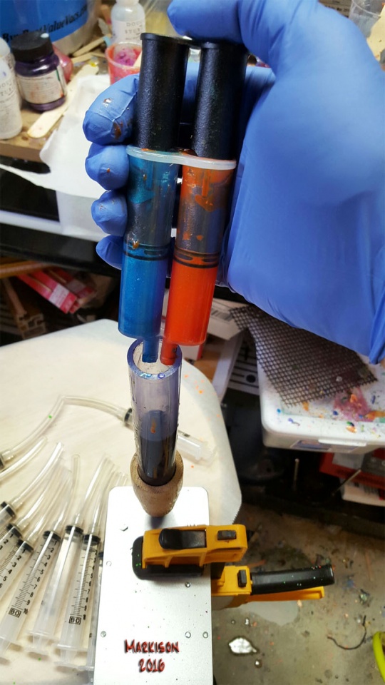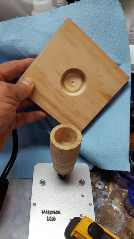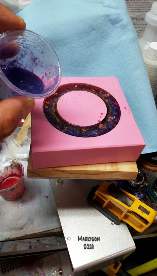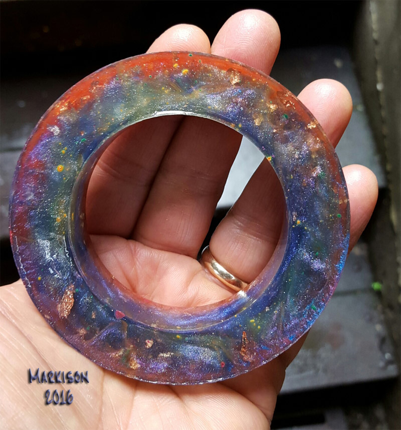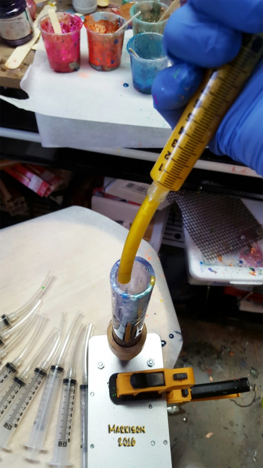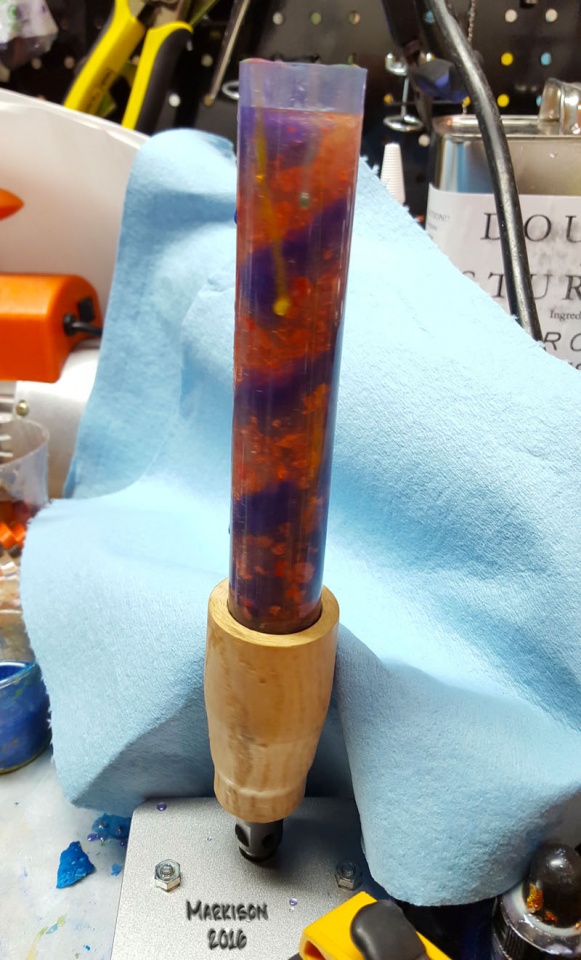 I'm enjoying my clear PVC pipe casting, but wanted to add controlled color spiraling throughout the blank - so I got a PennState blank drying system; clamped the (nice and slow 3rpm) motor to my bench with shaft facing upright upwards; drilled/tapped/turned a PVC pipe mold holder on the lathe, and screwed it onto the shaft; then lathe-bored the bottom of a wood square to serve as a platform for bangle mold rotation; poured a couple of color mixes into the slowly rotating mold; and to my surprise and pleasure, the simple system works, and the motor turns bi-directionally - stop it for a moment, and it turns the opposite direction for more possibilities; too much fun not to share; pix: