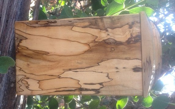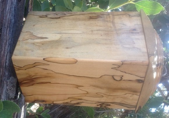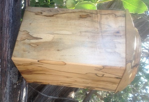 A box from splatted cottonwood 5.25" square by 10" tall. It is for a plastic box containing pet ashes. The boards were cut from a block of wood I got from a wood worker in the area. The finish is lacquer.