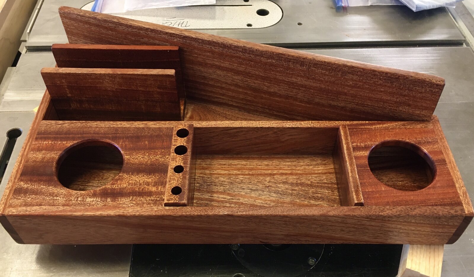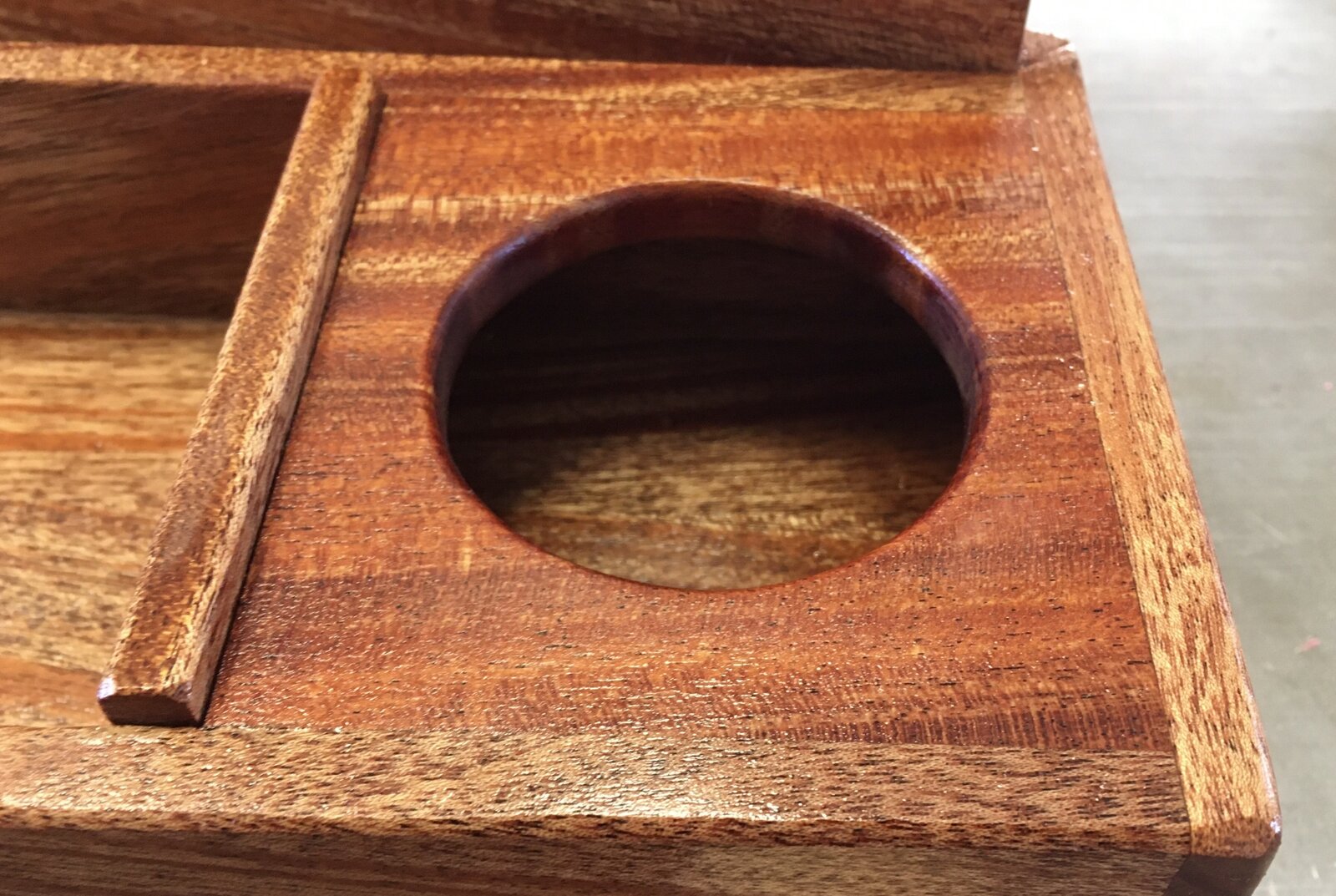 Cameron Cribben, a skipper on the Vagabond Sportfishing boat asked me to eliminate the clutter at the helm of the boat. He pointed to the three space paper sorter, pen cup, cup holder for two cups and various small trays; all of which were mismatched and, in a word, cheesy. What he wanted was a single good looking object to unify the storage. The space was oddly triangular as the helm curves. The boat has genuine mahogany wood everywhere and the wood is beautiful. Here is what I came up with using African mahogany mostly cut in the quartersawn orientation. I'm pretty sure they will get some custom mahogany pens with the delivery. There will be no charge as I've fished this boat since the early 1990's and really like both skippers - Mike Lackey & Cameron Cribben, the crew, chefs and the Vagabond. I hope Mike likes it.