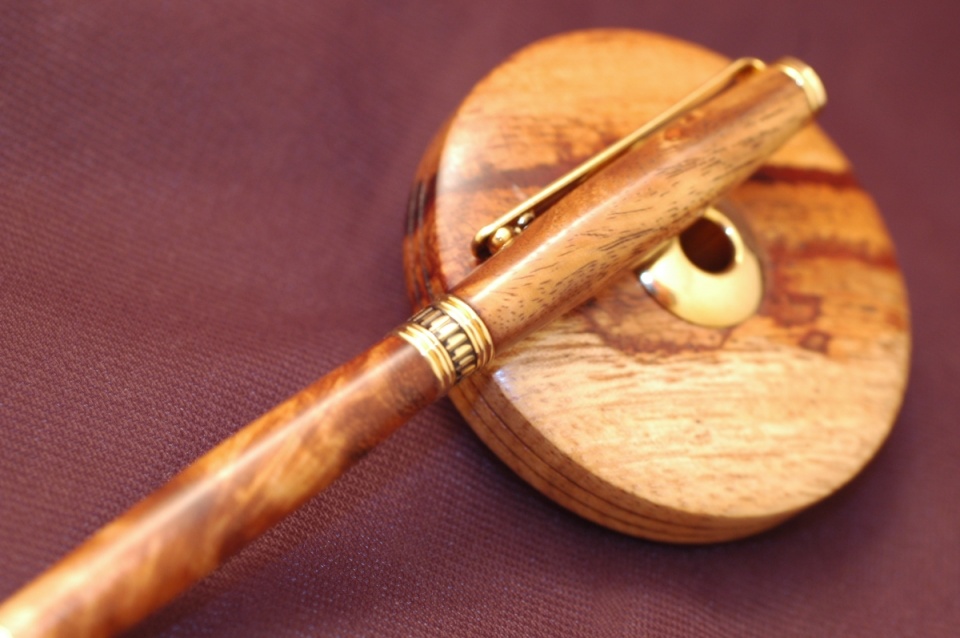 Ed made the pen and stand from pallet wood that was FOG. I believe he told me it was from India and he does not know the species but it turned very well. It has held up to my occasional use (while always displayed in my room, my PITH pens do not get used all the time) and has kept a nice finish with Ed's homemade finish and Mylands friction polish.