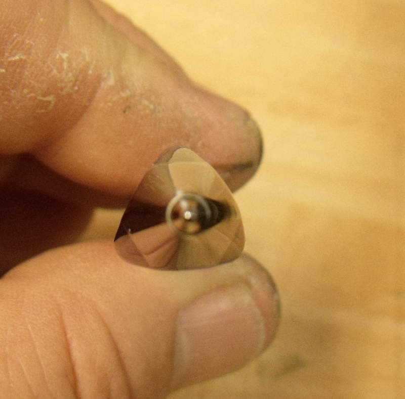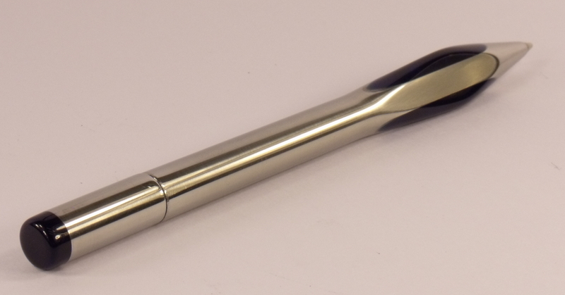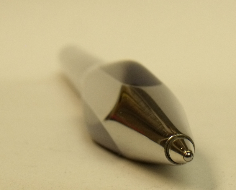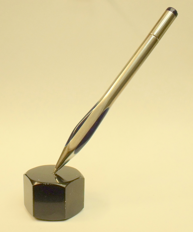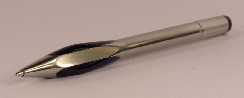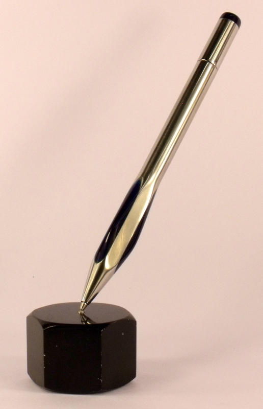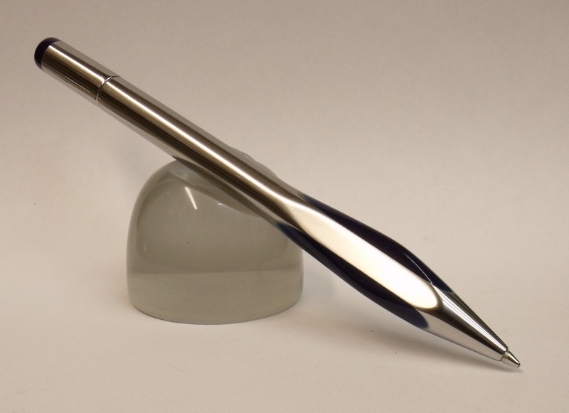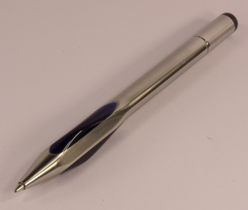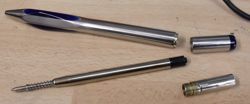 This ballpoint was made with stainless steel hex stock with just the grip area left unturned. 3 Sides were then fitted with blue PR bits to make the tri-lobe shape which is great to hold. The twist mech is in the finial / end cap. The three flats that the PR is fixed to was drilled with several holes to get a good key for the glue.