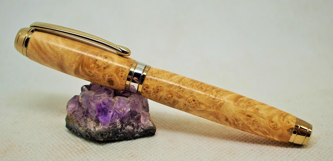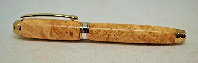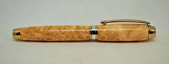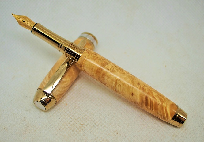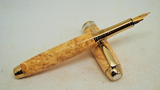 A Mistral Gold and Titanium Fountain pen made using Stabilised Box Elder Burl.