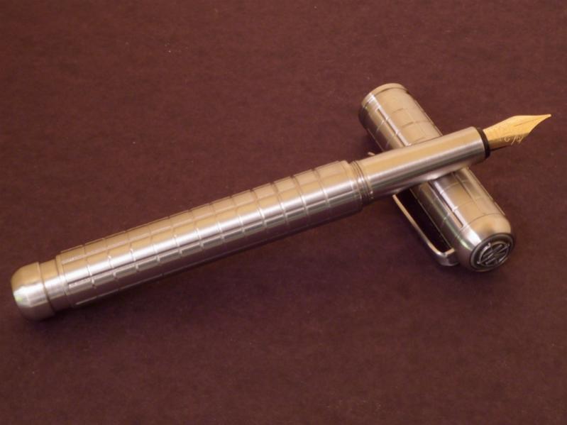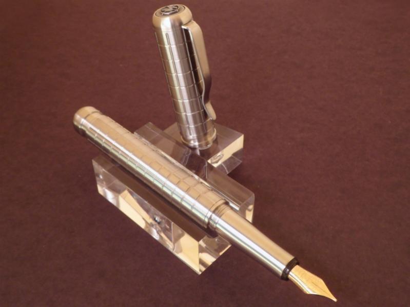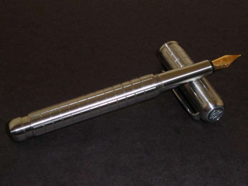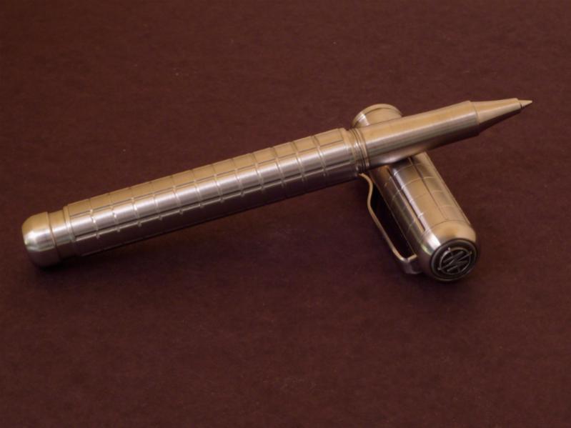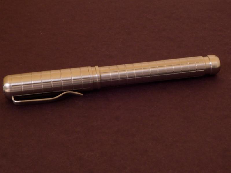 A Stainless Steel Marksman component set with both fountain and rollerball nibs wrapped in 303 Stainless Steel! The parts were machined so well that it was all a press fit. The lines were done on a mill and lathe for vertical and horizontal respectively.