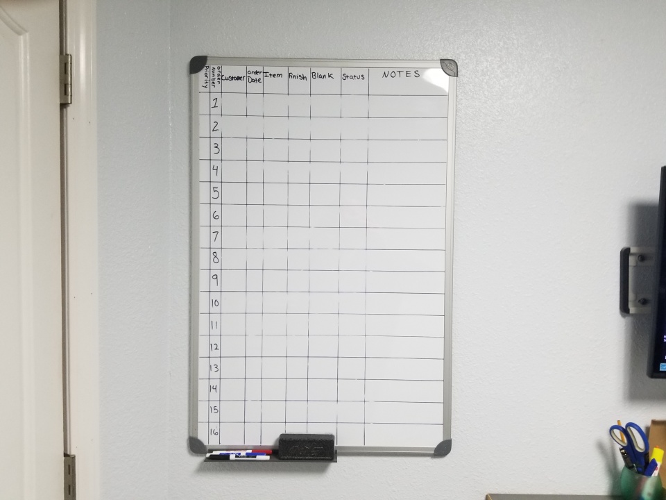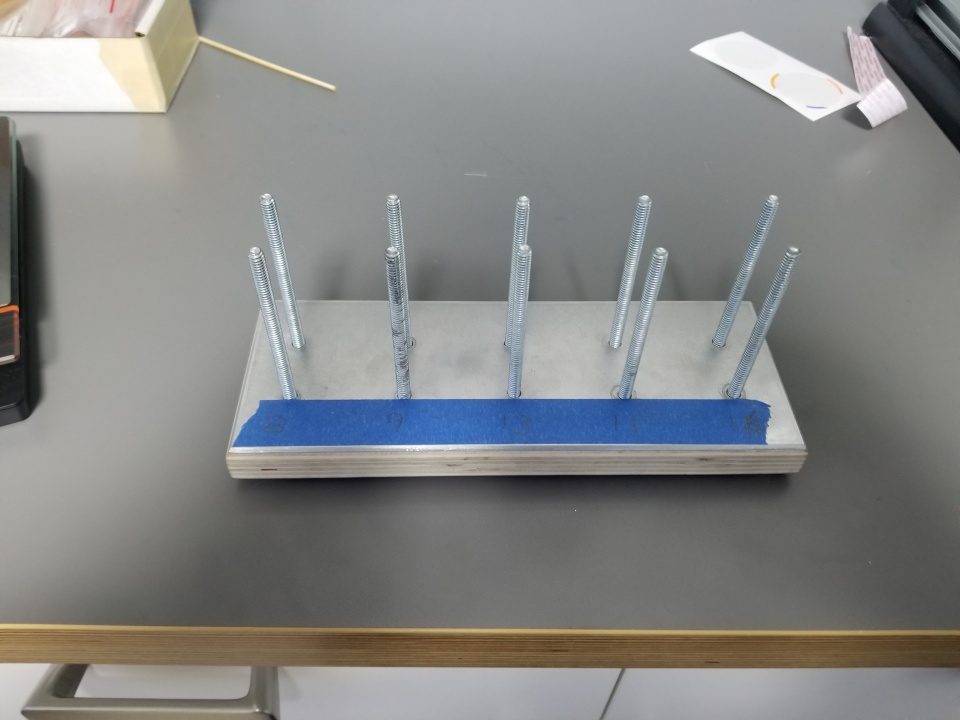 A suggestion I was offered here was a similar nail board but rather than lie flat on a table the nail board is two pieces of plywood forming an L, with the nails in the vertical portion. Two columns of nails close together, a space, two more columns close together, a space, and so on as many nails and columns as you desire. The left column in each pair is labelled clip, the right column in each pair is labelled nib. Using 3/4" blue masking tape, I also labelled columns for the pen styles.