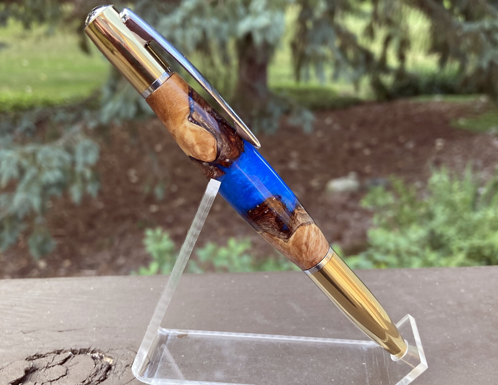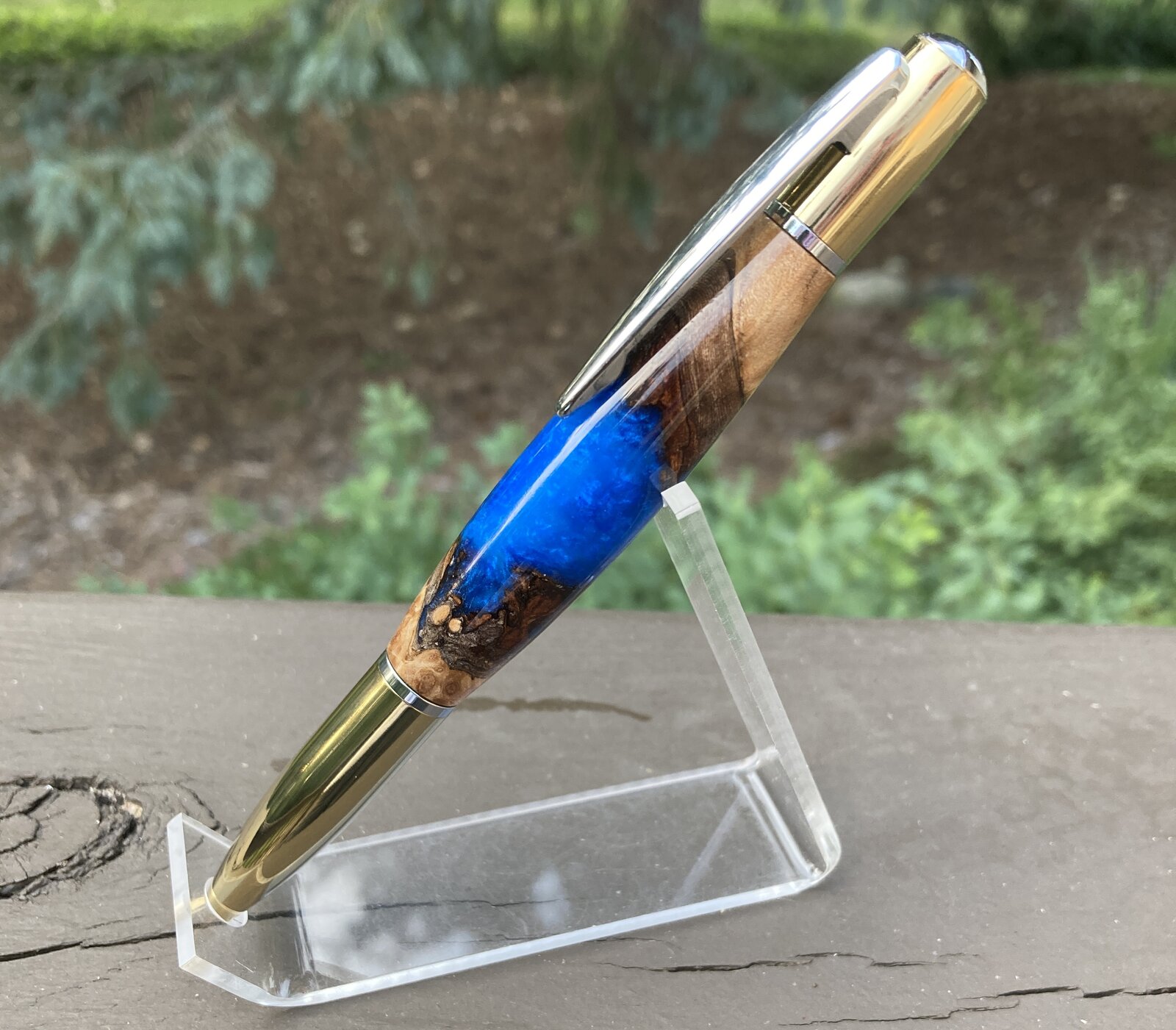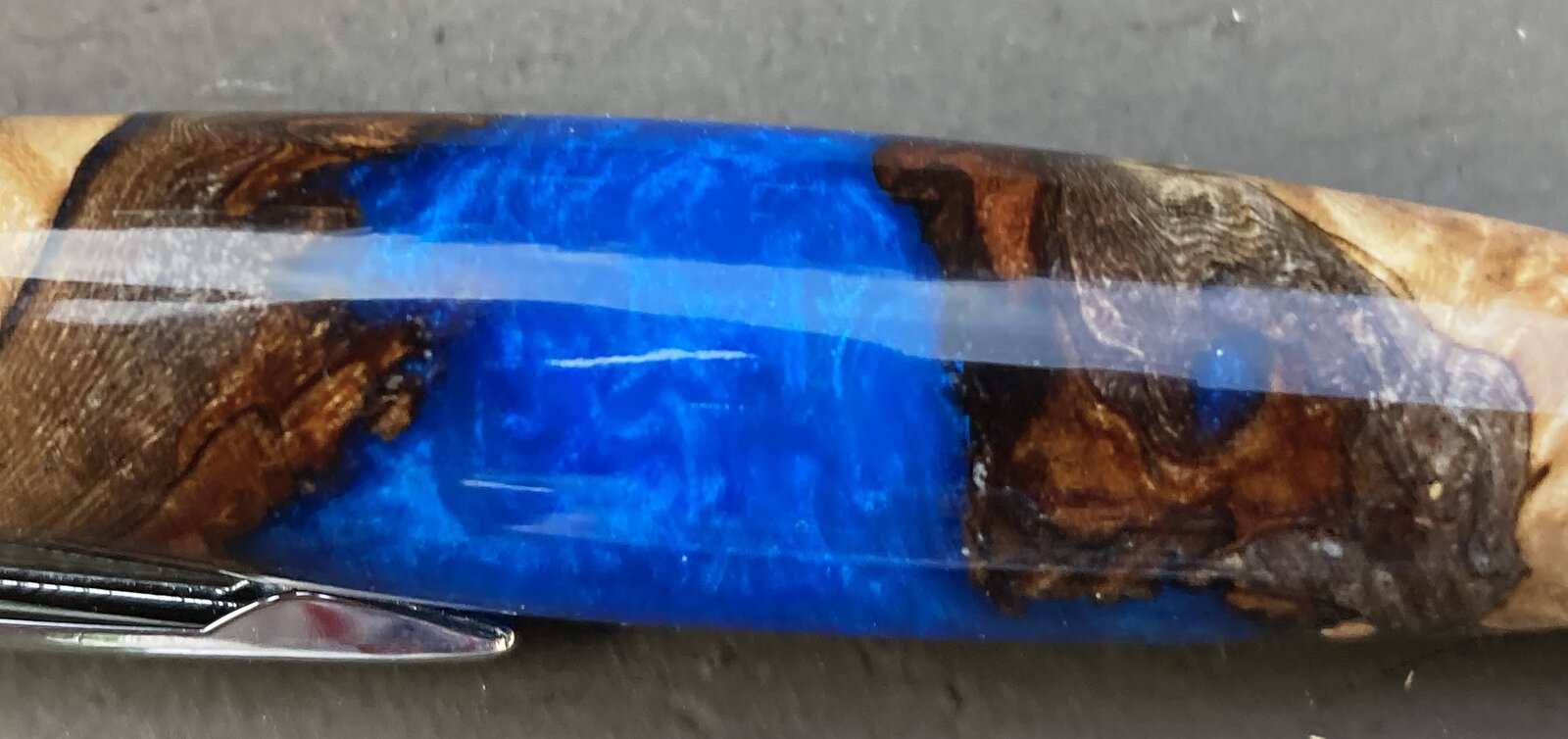 Second attempt at casting a hybrid blank - I learned a lot from the first attempt in green. This time I used more interesting wood chunks with live edge bark, and also painted the tube with epoxy pigmented with the same pigment as the casting resin. Still not entirely happy with it, but definitely liking the progress. If only I could remember to wipe the fingerprints off the pen before taking photos.