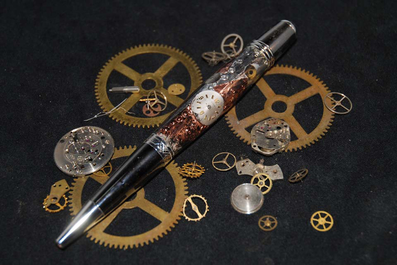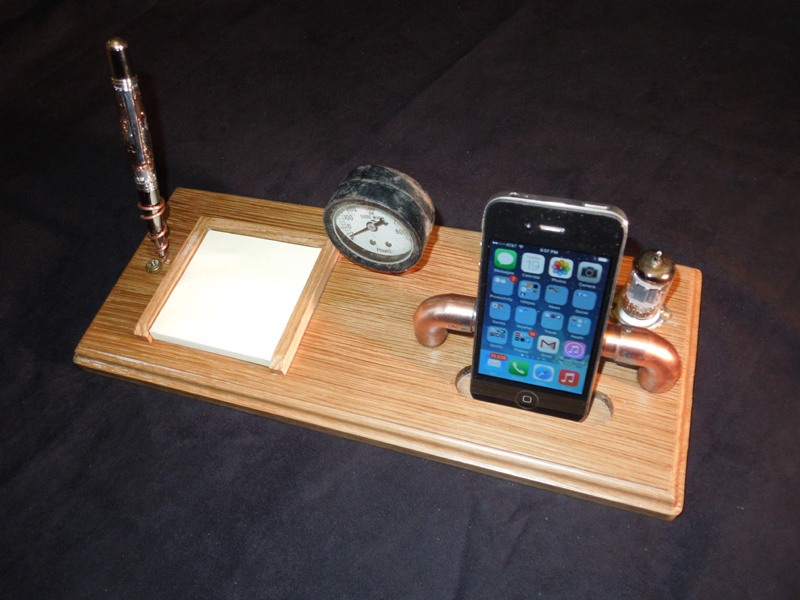 I figured that a good steampunk pen needed a way to show it off, so I put this combination pen holder/sticky note holder/phone holder/charging station together... It was fun. -gary