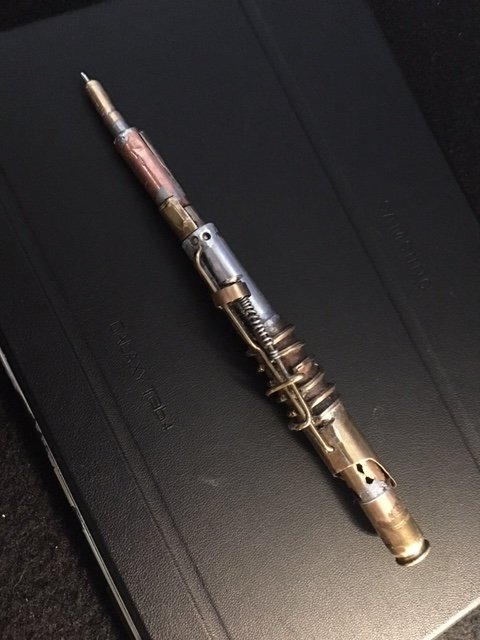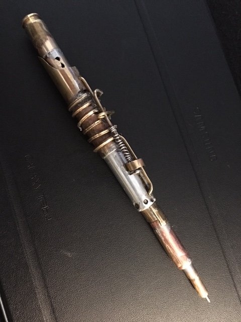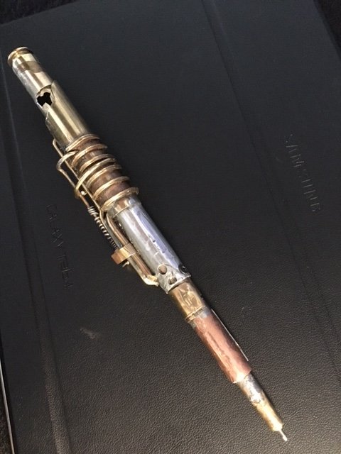 Torsion was the original name and posting because of the torsion spring that opens to release the pen ink tube. Features have been added which include a piece of aluminum which had been thrown in the trash and retrieved four times. that is why it is now known as the 'junkyard Torsion' pen. This is the last of the far left wing fantasy style pens for a while. Now we are leaning toward the right wing, streamlined fountain pens.