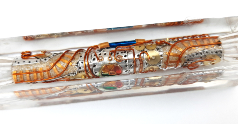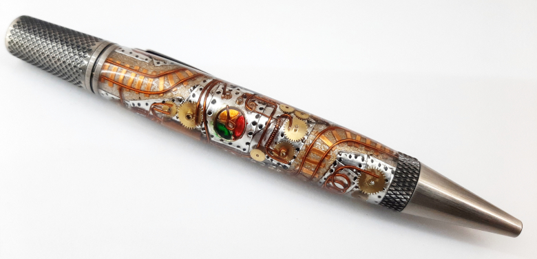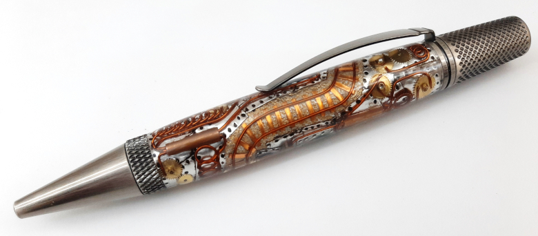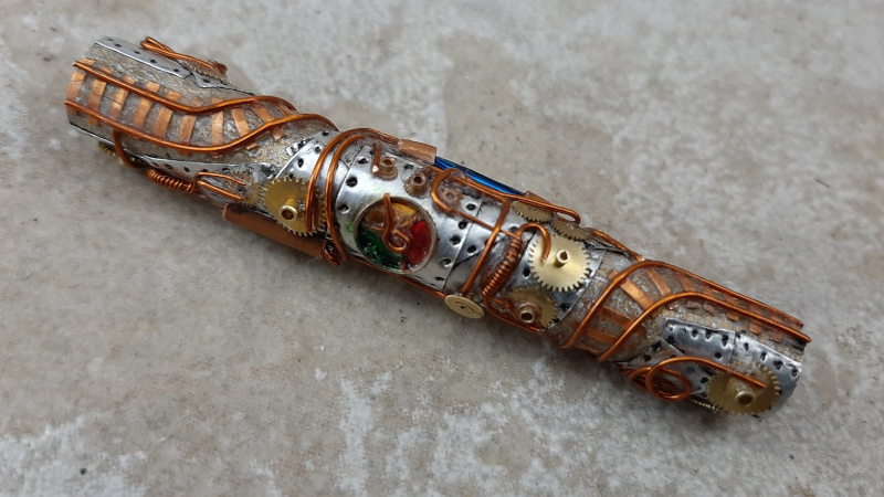 Copper Sheet, Copper Wire, Aluminum Tape, Watch Parts, Assorted Paints and a bit of Imagination went into making this blank and Pen