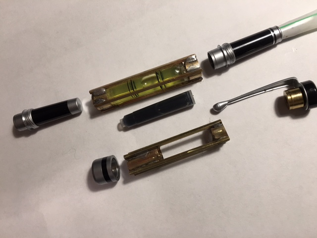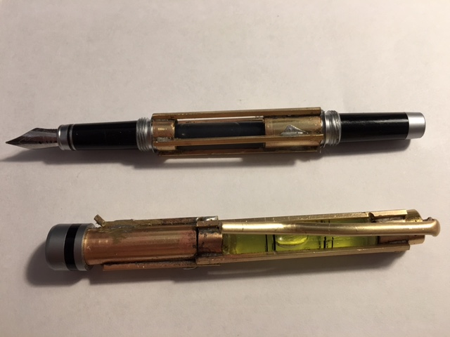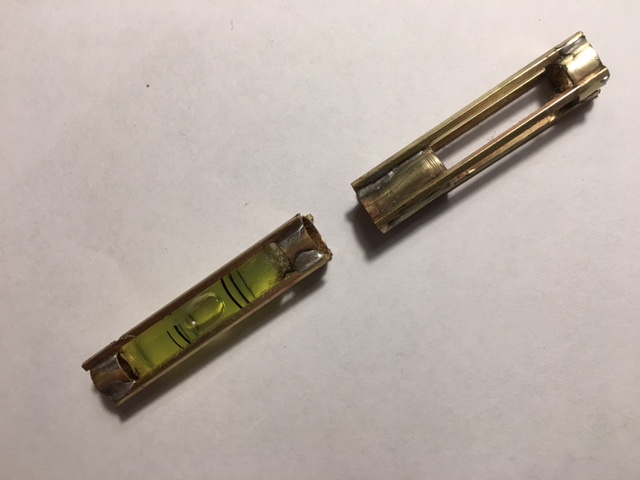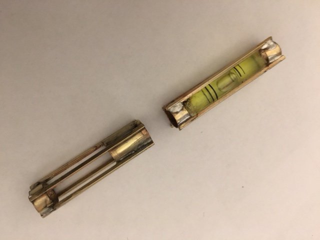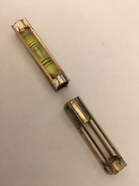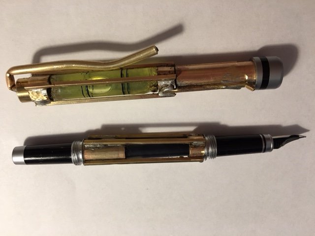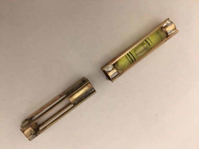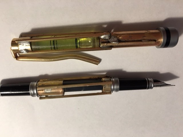I made a big blunder on the top end with the level bubble - that is where the pen nib is suppose to be housed. Now an extension needs to be soldered to the bottom. Soldering without melting the plastic level tube was a trick.