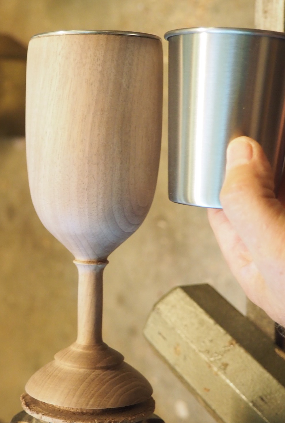 I bought some 8 oz stainless steel cups on amazon and made this stemmed cop. Walnut, finished with system 3 epoxy. I have some work to do to smooth out the finish.