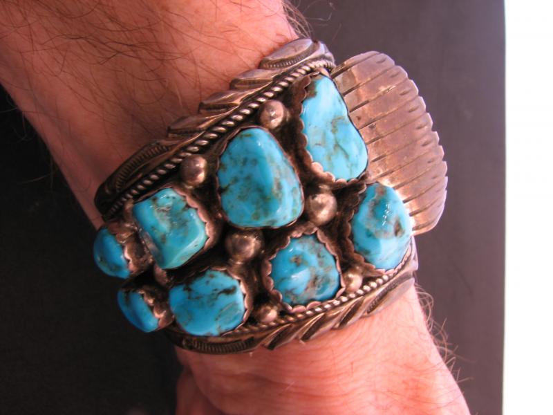 Well it is a Sterling silver Sedona with a black and green turquoise hand cast resin. I have had several booboo`s like this but really like the effect it gives. It is black PR that was still liquid and Turquoise that got a little jelly like,while doing other things. All I do it put the blob in the mold pour in the black and take 2 Popsicle sticks and cut the blob and drag it each way through the mold. It wants to keep springing back so I just had to keep trying to cut and drag till I had a full coverage of Turquoise through the whole mold and this is the result. I made it a closed end and it was sanded then sanded again through all the colored pads then polished with heavy and light scratch remover.