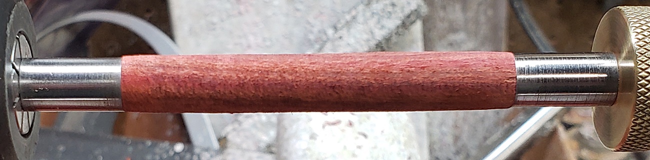 From there, you re-true the blank. If you have vibration problems like I do, this is necessary. I think, now that I've been digging into this problem for a couple weeks now, is due to several issues with...all of my mandrels and centers. Once I've have the blank trued up, and at this point for me this is the first time I'll hear the tool cut the wood cleanly without many vibrations or continual chatter or anything like that, then I can turn it down to the appropriate size by measuring with calipers. This is slower for sure, takes a lot of checking, and you have to take really fine, light cuts as the thinner the blank gets over the brass tube, the harder it is to avoid ripping it to pieces. There is still a small amount of vibration at the live center end...but, more on this in a moment.