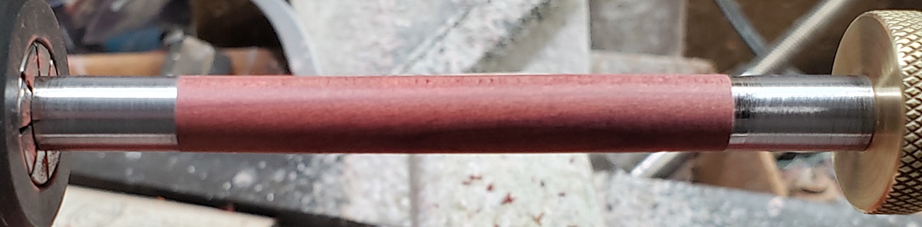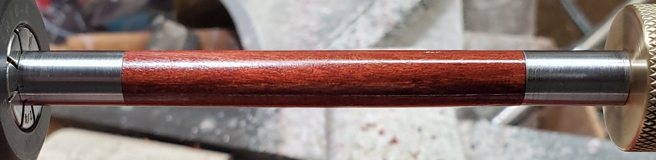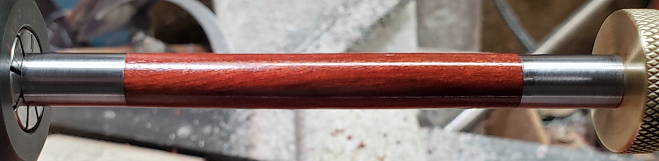 If I am extremely careful, once I'm turning sans bushings and just between centers, I can get the blank turned pretty accurately. In some cases, with some kits, I was able to turn a bit smaller than the bushings, as the bushings weren't really sized right...the bands on two kits I turned recently have convex aspects to them, and when turning just down to the bushings, the blanks have a hard right-angle edge that butts up against these convex shapes, and it doesn't look good. On the second of these two kits, I did this sans-bushing TBC turning, and turned the blank down to about ~0.445", while the bushings were ~0.46". The second kit looks better. The wood ended up quite thin doing this, however, so its very very delicate work! I have picked up some Mercury Flex CA to try CA finishing again...I have always been worried that adding CA will expand the diameter of the pen (well, at least in my experience, it does, making the blank thicker than the bushings). I think with sans-bushing turning, I will be able to thin the blank out a bit more, giving me room to build up some layers of CA without that worry...hopefully.
