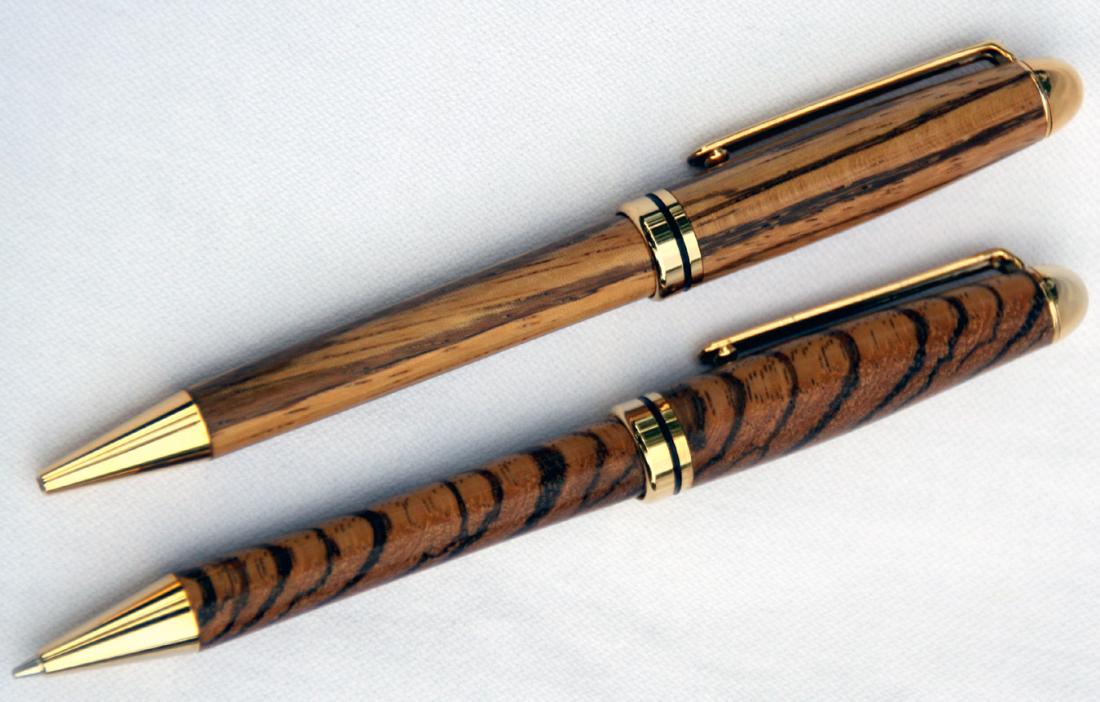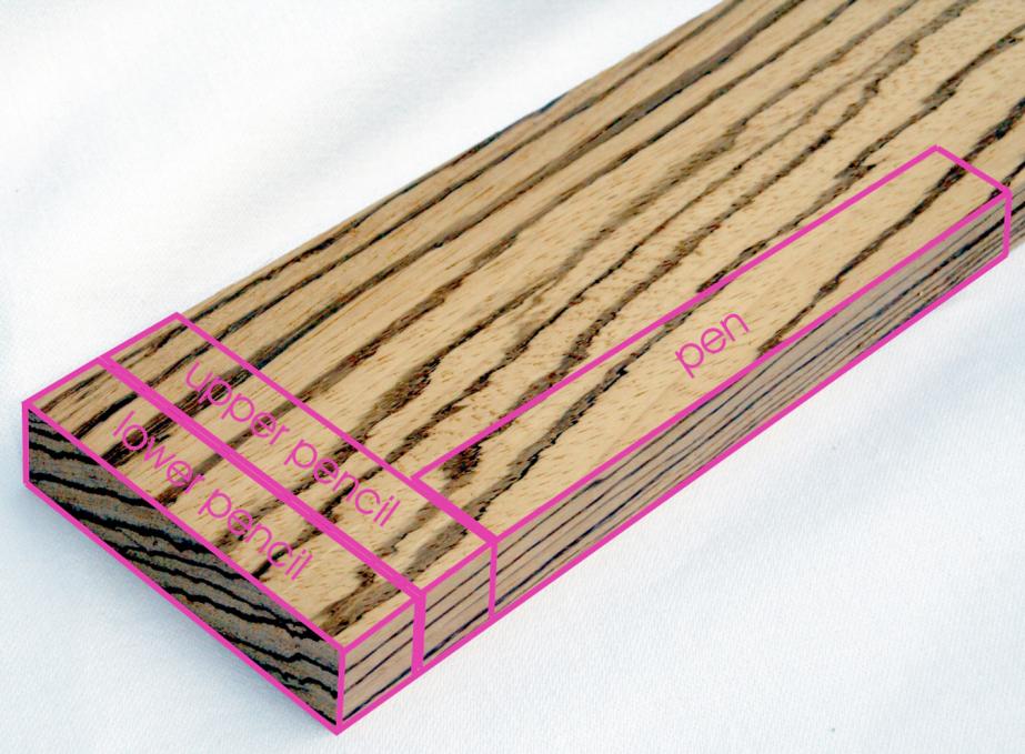 My continued study of wood grains resulted in this zebrawood pen and pencil set. The second picture shows the board from which the pen blanks were cut. The way the light catches the cross grain in the pencil makes it look unrelated to the long grain pen.