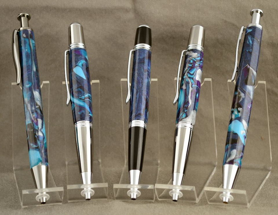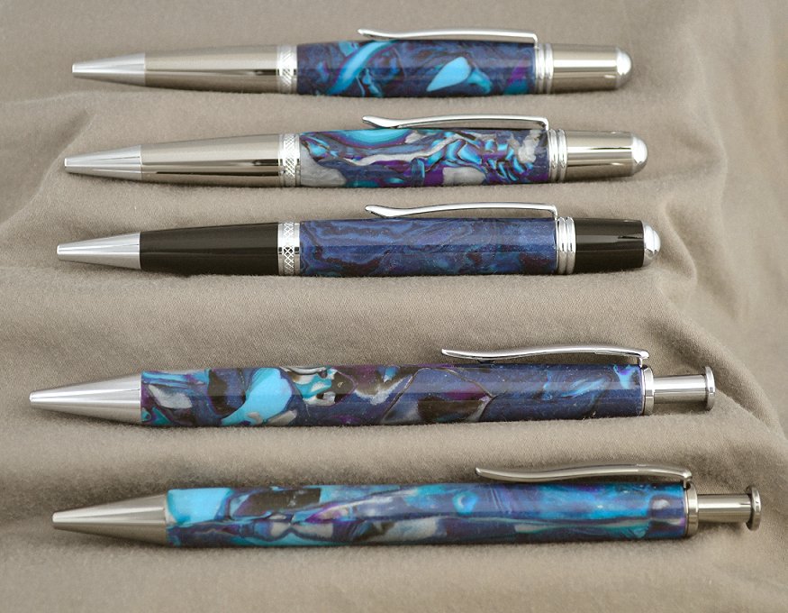 The Chrome and Black Titanium Long Clickers flank two Classic Nib Arrows. The Arrow on the left has the blank I entered. I re-finished and polished it. The Arrow on the right is my favorite. The Manhattan in the middle has what I'm calling "The Midnight Abyss." I'll spend the rest of my life trying to replicate it without success.