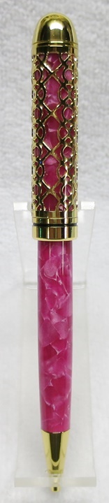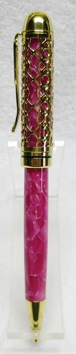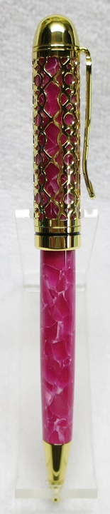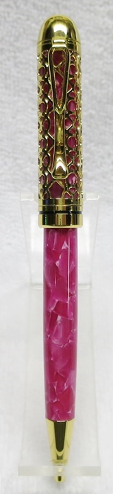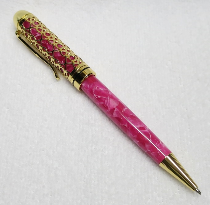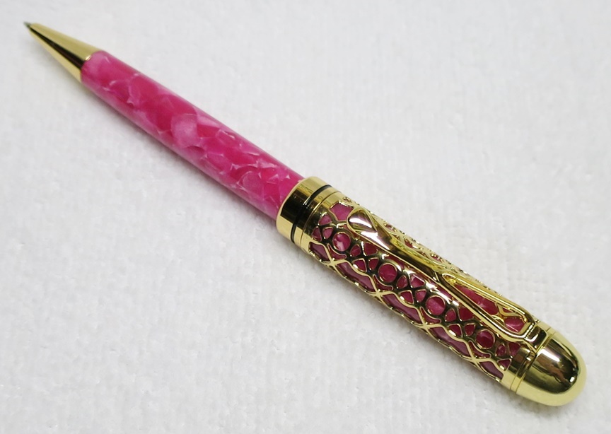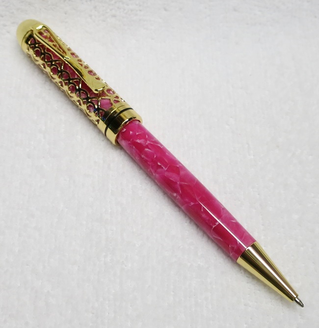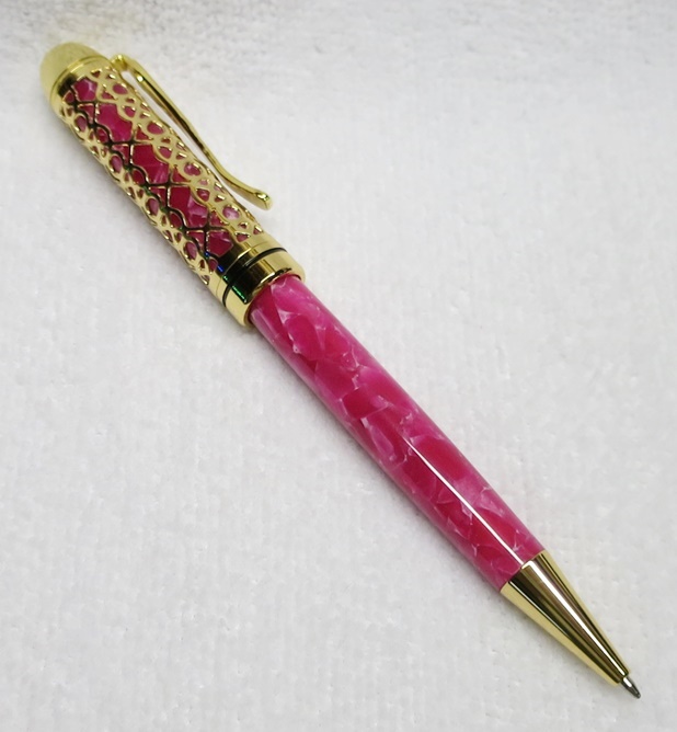 This pen is called Summit Fancy, and it's from Rockler. The blank is called Hot Pink Crush. I've never been a fan of filigree pens, they look gaudy to me. But I made a flat top version for my mom probably 16 years ago, and it's one of her favorites. When I saw this kit at Rockler, I knew I had to make one for her. The first one I made was with a white pearl blank. I decided to use a brightly colored blank this time, and chose this hot pink one. In spite of the filigree, I do like the way this one turned out. And I daresay, my mom will love it.
